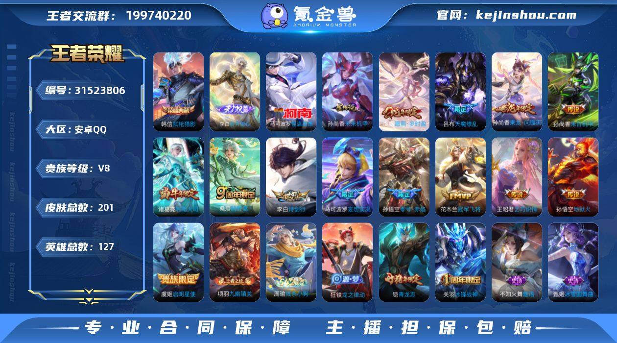CHC10956,/1星元/钱包未注销,安卓Q-V8-最强王者段位-127英雄-201皮肤-1典藏皮肤-1无双-1珍品传说-13传说-49史诗 【英雄全皮】:影全皮 【荣耀典藏】:韩信弑枪猎影 【无双皮肤】:李白碎月剑心 【珍品传说】:马可波罗怪盗基德 【传说皮肤】:虞姬愿照岁时盈,桑启鸣野蒿,孙尚香乘龙问璇玑,马可波罗妄想实况,李白诗剑行,王昭君乞巧织情,诸葛亮时雨天司,虞姬启明星使,孙悟空零号赤焰,花木兰冠军飞将,孙尚香末日机甲,孙悟空地狱火,吕布天魔缭乱 【限定皮肤】:白起狰,姜子牙天穹之誓,李白谪仙醉月,狄仁杰阴阳师,虞姬凯尔特女王,赵云皇家上将,嬴政优雅恋人,孙膑妖精王,扁鹊炼金王,芈月重明,吕布天魔缭乱,夏侯惇朔风刀,曹操烛龙,典韦穷奇,马可波罗逐梦之星,马可波罗妄想实况,狄仁杰魔术师,狄仁杰万华元夜,项羽海滩派对,项羽霸王别姬,老夫子醍醐杖,关羽冰锋战神,程咬金演武夺筹,韩信逐梦之影,孙悟空零号赤焰,牛魔御旌,虞姬启明星使,雅典娜黎明之约,蔡文姬繁星吟游,太乙真人饕餮,鬼谷子原初探秘者,诸葛亮时雨天司,铠青龙志,百里玄策原初追逐者,弈星混沌棋,明世隐疑决卦,裴擒虎李小龙,狂铁御狮,米莱狄御霄,云中君纤云弄巧,盾山御銮,上官婉儿梁祝,鲁班大师探海日志,张良古海寻踪,鬼谷子天穹祈灯,李白碎月剑心,孙尚香乘龙问璇玑,沈梦溪龙舞盛年,刘邦剑破天穹,周瑜熔金海岸 【年限皮肤】:铠青龙志,诸葛亮时雨天司,孙尚香乘龙问璇玑,虞姬愿照岁时盈 【赛季限定】:孙膑妖精王,扁鹊炼金王,虞姬凯尔特女王,白起狰,太乙真人饕餮,曹操烛龙,芈月重明,典韦穷奇,狂铁御狮,米莱狄御霄,牛魔御旌,盾山御銮,夏侯惇朔风刀,弈星混沌棋,明世隐疑决卦,老夫子醍醐杖,鬼谷子原初探秘者,狄仁杰万华元夜,程咬金演武夺筹,鲁班大师探海日志,张良古海寻踪,...