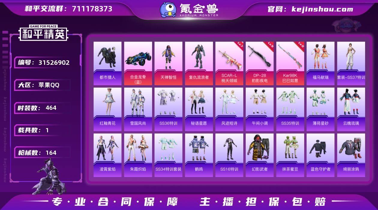 实名:可二次实名 是否支持人脸包赔:支持 粉装数量:2 特效枪数量:3 载具数:1 时装数:464 枪械数:164 都市猎人 复仇流浪者,天禅智恒 七级SCAR-L-桃夭倾城,五级DP-28-豹影疾电,五级Kar98K-巳巳如意 合金龙骨(蓝) 福马献瑞,红釉青花,SS37特训,雪国风尚,SS36特训,炫彩糖果,风迹短诗,秘语星愿,SS35特训,午间小调,薄荷星砂,云魄琉璃,凌霄紫焰,SS34特训套装,朱霞炽焰,暗夜行者,冰川特警,冰冻风暴,缤纷果语,暴风机械师,滨海厨神,白色伏地魔,长空猛禽,都市丽猫,都市猎人,飞驰魅影,疯狂小兔子,福星高照,格斗先锋,光之冒险,幻彩翩翩,鹤鸣,湖蓝色名流,黑色伏地魔,灰色格斗者,黄色名流,黄色运动,红色运动,和煦暖阳,黑夜传说,幻影武者,捷德奥特曼,极地朋克,酒红色名流,娇憨猪猪,竞技名士,极速红龙,街头潮人,街头风暴,金羽特工,绛羽幽主,狂沙舞者,空投萌叽,蓝彩潮人,龙的传人,琉璃情波,蓝色守护者,蓝色运动,冷焰舞者,漫步者,抹茶蜜豆,摩登艾咪,猛禽,妙红点点,魅力单车,果汁能量,麻辣教官,萌趣咩咩,萌趣颜团子,霓虹极客,柠萌假日,牛气冲天,牛气满满,欧布奥特曼,破蛋小黄鸡,轻风白浪,绮丽涂鸦,青年教官,瑞龙福将,人气偶像,热血青春,时空追击者,沙漠毒蛇,SS12特训,SS15特训,SS16特训,SS17特训,SS18特训,SS19特训,SS20特训,SS21特训,SS22特训,SS23特训,SS25特训,SS27特训,SS28特训,SS31特训套装,SS32特训套装,SS33特训套装,特训学院,团圆交子,田园牧歌,特种颜团子,特战装甲,完美偶像,星夜迷魅,异彩先驱,耀粉歌者,音速流光,夜瞳黯灵,玉兔迎春,野性战心,鹰眼刺客,鱼渊荷华,燕燕于飞,战地督导 炫彩糖果降落伞,炫彩糖果飞行器,彩虹甜喵降落伞,伏魔团降落伞,环太平洋降落伞,幻影战神降落伞,临安公主降落伞,翩跹演武降落伞,深海曼妙降落伞,桃夭倾城降落伞