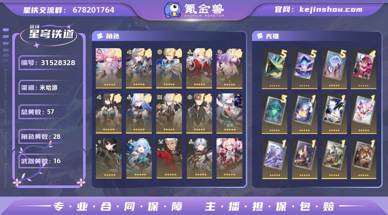 账号信息 服务器:官服(互通) 开拓等级:70 级满级 限定五星:28 个 常驻五星:12 个 五星专武:9 把(全是对应角色专武) 星琼/车票:0 练度:8 小毕业 + 8 大毕业 + 5 完美毕业 账号状态:成人号,安全可换绑,无找回风险 核心亮点 - 版本人权角色齐全,景元 1+1、阮梅 1+1 、遐蝶0+1完美毕业,输出辅助天花板拉满 - 黄泉、镜流、龙丹、希儿、阿刃、风堇、白厄、遐蝶、星期日、罗刹、昔涟、爻光等高人气角色全有 - 多角色 0+1 大毕业/完美毕业,深渊、虚构、末日全通无压力 - 高练度成品号,上手即玩,不用再肝养成,直接体验全部内容 - 官服安全号,换绑流程正规,放心购买 适合人群 想一步到位、直接玩顶配账号、不想从头养成的玩家,图鉴党、强度党都合适。