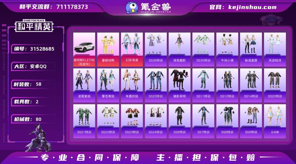 【和平精英】地铁满天赋 5w5热力值1绝世 3粉装4特效枪2载具【3级幻星粉玛莎】梦幻火箭 暗影哥特 猫包 满级妹控 3粉装,4特效枪,2载具,历史最高段位:绝世王牌15星 王牌印记10次 热力值:55871,135套装,181枪械,186装备,104战备;套装:套装-梦幻火箭,套装-垂柳戏鸭,套装-幻彩电音,套装-特训学院,套装-黄色伏地魔,套装-白色伏地魔,套装-黑色伏地魔,套装-骑行爱好者,套装-竞技名士,套装-深蓝色名流,套装-湖蓝色名流,套装-黄色名流,套装-猛禽,套装-游猎者,套装-野性山猫,套装-长空猛禽,套装-竞技勇士朋克,套装-旭日情侣,套装-冷焰舞者,套装-灼焰舞者,套装-刚毅裁决者,套装-特战装甲,套装-战地菁英,套装-浪漫假日,套装-战地督导,套装-特殊使命,套装-黄色格斗者,套装-甜蜜告白,套装-迎春赐吉,套装-春日漫步,套装-完美偶像,套装-幻影武者,套装-决胜时刻,套装-魅力单车,套装-绮丽涂鸦,套装-坚韧舞者,套装-夜莺强袭者,套装-野性战魂,套装-都市魅力,套装-SS2特训,套装-雪山精英,套装-幻世战舞者,套装-半糖蓝莓,套装-暗影哥特,套装-夏日倾情,套装-缤纷果语,套装-滨海厨神,套装-特种空勤,套装-幻影公爵,套装-格斗先锋,套装-麻辣教官,套装-SS3特训,套装-攀登者,套装-SS4特训,套装-破蛋小黄鸡,套装-疯狂小兔子,套装-舞夜骑士,套装-SS5特训,套装-圣诞大吉,套装-金鼠迎春,套装-北国孤狼,套装-SS6特训,套装-SS7特训,套装-鹤鸣,套装-SS8特训,套装-智慧之神,套装-萌黄之夏,套装-SS9特训,套装-牛气满满,套装-白糯汤圆,套装-SS11特训,套装-白虎圣者,套装-原初圣火,套装-逆风勇士,套装-SS12特训,套装-牛气冲天,套装-耀粉歌者,套装-SS14特训,套装-电音精灵,套装-福星高照,套装-SS20特训,套装-覆海蛟龙,套装-甜心亚梦,套装-虚音幻奏,套装-SS21...