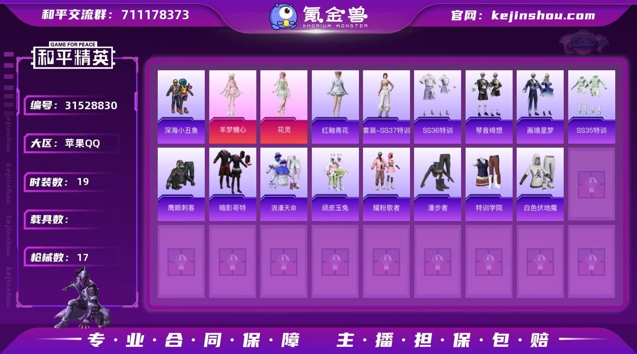 【和平精英】2粉装5特效枪 花灵 羊梦糖心 深海小丑鱼 浪漫天命 2粉装,5特效枪,0载具,历史最高段位:卓越王牌13星 王牌印记4次 热力值:21698,79套装,74枪械,86装备,49战备;套装:角色-羊梦糖心,角色-花灵,套装-特训学院,套装-猎鹰,套装-青年教官,套装-橘黑制服,套装-红色运动,套装-黄色运动,套装-蓝色运动,套装-黄色伏地魔,套装-白色伏地魔,套装-黑色伏地魔,套装-竞技名士,套装-深蓝色名流,套装-湖蓝色名流,套装-黄色名流,套装-猛禽,套装-长空猛禽,套装-漫步者,套装-冷焰舞者,套装-灼焰舞者,套装-浪漫天命,套装-特战装甲,套装-战地督导,套装-鹰眼刺客,套装-完美偶像,套装-幻影武者,套装-街头潮人,套装-暗金炫舞,套装-蓝彩潮人,套装-魅力单车,套装-竞技达人朋克,套装-破晓战魂,套装-都市魅力,套装-幻世战舞者,套装-暗影哥特,套装-深海小丑鱼,套装-青涩时光,套装-缤纷果语,套装-元素星魂,套装-破蛋小黄鸡,套装-鹤鸣,套装-顽皮玉兔,套装-白糯汤圆,套装-战术大师,套装-耀粉歌者,套装-玉兔迎春,套装-绯格组合,套装-王牌教练,套装-柠萌假日,套装-香桃花海,套装-冰河战士,套装-漫游都市,套装-云魄琉璃,套装-恋语绒绒,套装-老实芭蕉,套装-异域银装,套装-星途旅人,套装-SS30特训,套装-SS31特训,套装-SS33特训,套装-巳巳如意,套装-SS32特训,套装-青翼流星,套装-大橘大利,套装-炫彩糖果,套装-元气之梦,套装-SS34特训,套装-薄荷星砂,套装-SS35特训,套装-琴音绮想,套装-粉黛兰香,套装-画境星梦,套装-SS37特训,套装-SS36特训,套装-红釉青花,套装-雨过天青,套装-萌鸡速递,套装-玲珑侠影;枪皮:AKM-涂鸦街区,AKM-霓彩脉冲,ACE32-画境星梦,ACE32-冰晶雪宝,蜜獾-乌木金纹,GROZA-影袭,GROZA-福马献瑞,AC-VAL-天降萌叽,G36C-星穹咏叹调...