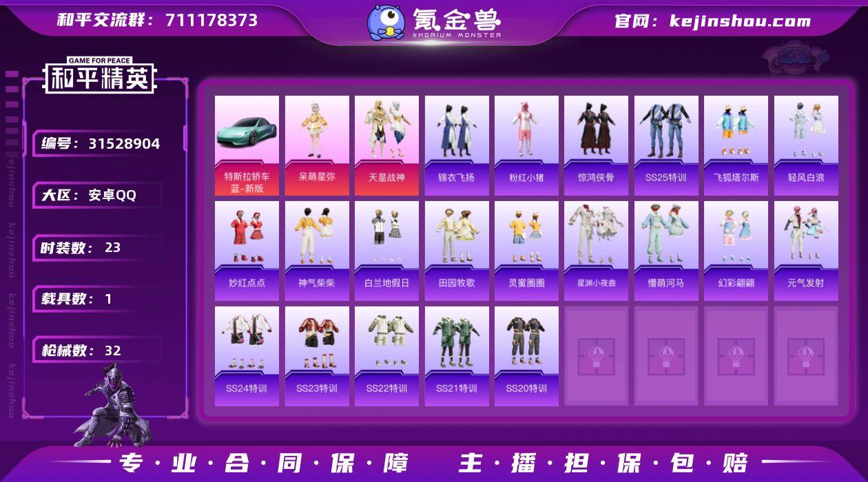 【和平精英】2粉装5特效枪1载具 呆萌星妳 4级M4五爪金龙 4级死噶纯梦嫁纱 特斯拉 2粉装,5特效枪,1载具,历史最高段位:荣耀皇冠Ⅱ 王牌印记-1次 热力值:25108,48套装,89枪械,81装备,37战备;套装:角色-呆萌星弥,套装-天星战神,套装-黑色伏地魔,套装-竞技名士,套装-深蓝色名流,套装-猛禽,套装-长空猛禽,套装-坚韧舞者,套装-都市漫游者,套装-幻世战舞者,套装-冰川特警,套装-粉红小猪,套装-萌黄之夏,套装-探宝勇士,套装-牛气满满,套装-战术大师,套装-SS20特训,套装-SS21特训,套装-SS22特训,套装-田园牧歌,套装-轻风白浪,套装-SS23特训,套装-飞狐塔尔斯,套装-白兰地假日,套装-神气柴柴,套装-懵萌河马,套装-灵蜜圈圈,套装-妙红点点,套装-幻彩翩翩,套装-王牌教练,套装-柠萌假日,套装-青玉碎影,套装-SS24特训,套装-龟仙人,套装-SS25特训,套装-惊鸿侠骨,套装-锦衣飞扬,套装-元气发射,套装-龙的传人,套装-恋语绒绒,套装-SS31特训,套装-智谋强哥,套装-SS33特训,套装-SS32特训,套装-大橘大利,套装-星渊小夜曲,套装-SS34特训,套装-薄荷星砂;枪皮:AKM-彩虹符号,AKM-2P战斗服款,AKM-龙的传人,AUG-耀粉歌者,AUG-冰川粉黛,AUG-天降萌叽,Famas-乌木金纹,GROZA-彩虹符号,GROZA-田园牧歌,GROZA-懵萌河马,G36C-懵萌河马,M16A4-幻世战舞者,Mk47-乌木金纹,Mk47-妙红点点,Mk47-炫光之旅,4级SCAR-L-纯梦嫁纱,SCAR-L-红色方程式,SCAR-L-炫彩节奏,SCAR-L-玉兔迎春,QBZ-彩虹符号,蜜獾-天降萌叽,蜜獾-乌木金纹,4级M416-五爪金龙,M416-蓝色火焰,M416-糯团青竹,M762-天降萌叽,AC-VAL-乌木金纹,AWM-音爆索尼克,4级Kar98K-巳巳如意,Kar98K-红色方程式,M200-惊鸿侠骨,M200-乌木金纹,莫辛纳甘-乌木金纹,莫辛纳甘-懵萌河马,AMR-妙红点点,M24-炫彩节奏,M24...