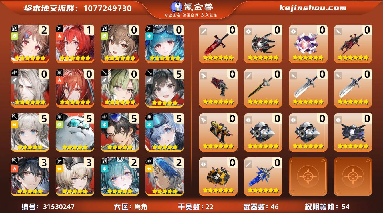 极品成品号!!1+1大毕业42姐,火队冰队物理队全齐,常驻全有,2+1小羊,还有一个角色自选和好几个武器自选没用。谷地和武陵地图全探索,基建毕业,任务只剩地图上几个小任务,号上还剩20多抽