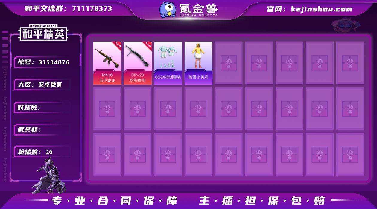 安卓微信 可二次 2特效枪15套装26枪皮 M416-五爪金龙 (5级) DP-28-豹影疾电 (3级 破蛋小黄鸡 M762-奇异狩猎者 和平精英账号