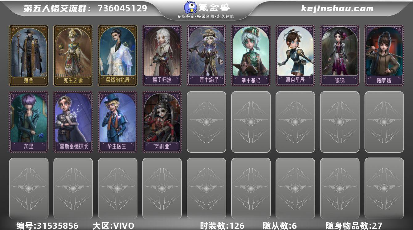 时装数:126 随从数:6 随身物品数:27 隐士-薄金,“逃脱大师”-死生之谕,宿伞之魂-粲然的北辰 卖家说:双限定金,多联动皮,过万紫薯,近万线索,还有两张紫皮卡