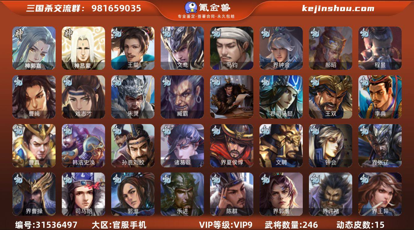 VIP等级: VIP9 官阶: 骠骑将军 武将数量: 246 动态皮肤数量: 15 神将: 神郭嘉,神吕蒙 魏国武将: 戏志才,曹纯,程昱,郝昭,界钟会,马钧,文鸯,王粲,唐咨-魏,徐庶,张辽,SP关羽,SP姜维,SP庞德,卞夫人,曹昂,曹操,曹冲,曹洪,曹丕,曹仁,曹叡,王异,鲁芝,界满宠,曹休,界曹植,满宠,荀攸,王基,钟繇,郭嘉,荀彧,阮慧,界郭嘉,崔琰,界荀彧,朱灵,吕虔,界王异,界许褚,界郭淮,陈群,乐进,郭淮,夏侯惇,曹植,司马朗,界曹操,许褚,界张辽,谋徐晃,张郃,钟会,文聘,曹彰,界夏侯惇,诸葛诞,司马懿,甄姬,徐晃,孙资刘放,韩浩史涣,曹真,典韦,夏侯渊,李典,于禁,王双,邓艾,界司马懿,孟达-魏,臧霸,朱灵(国战) 蜀国武将: 董允,花鬘,谯周,谋马超,徐庶,界魏延,杨仪,界伊籍,费祎,界黄月英,赵云,张松,彭羕,李丰,界刘备,谋姜维,刘封,谋庞统,黄月英,关羽,王甫赵累,吴懿,祝融,张飞,黄皓,魏延,界周仓,马忠,界法正,糜夫人,刘禅,张翼,关银屏,SP孙尚香,SP徐庶,卧龙诸葛,周仓,简雍,界关兴张苞,诸葛亮,界张飞,法正,赵统赵广,界马岱,关平,马岱,庞统,诸葛果,马谡,马超,廖化,关兴张苞,孟获,夏侯氏,黄忠,刘备,界马超,马良,蒋琬费祎,刘谌,蜀-孟达,彭羕(国战),甘夫人,SP甘夫人 吴国武将: 界徐盛,骆统,文鸯,潘濬,周泰,全琮,吕蒙,诸葛恪,界孙尚香,大乔小乔,谋甘宁,许贡,丁奉,谋吕蒙,孙茹,顾雍,孙亮,孙休,严畯,界孙权,界孙休,界吕蒙,凌操,谋黄盖,孙尚香,程普,大乔,韩当,陆逊,诸葛瑾,吕范,太史慈,虞翻,界黄盖,孙鲁班,界周瑜,孙权,谋小乔,鲁肃,界甘宁,吴国太,甘宁,界大乔,孙坚,孙鲁育,步练师,周瑜,小乔,潘璋马忠,黄盖,吕岱,界陆逊,吴-唐咨,徐盛,张昭张纮,朱桓 群国武将: 麹义,兀突骨,左慈,伏完,华雄,董白,刘琦,袁术,高顺,刘繇,界庞德,于吉,界公孙瓒,吕布,马日磾,李儒,张济,公孙瓒,SP赵云,蔡夫人,界刘表,樊稠,界张角,潘凤,界袁术,陈宫,SP马超,蹋顿,界华佗,贾诩,羊祜,庞德,张宝,刘...