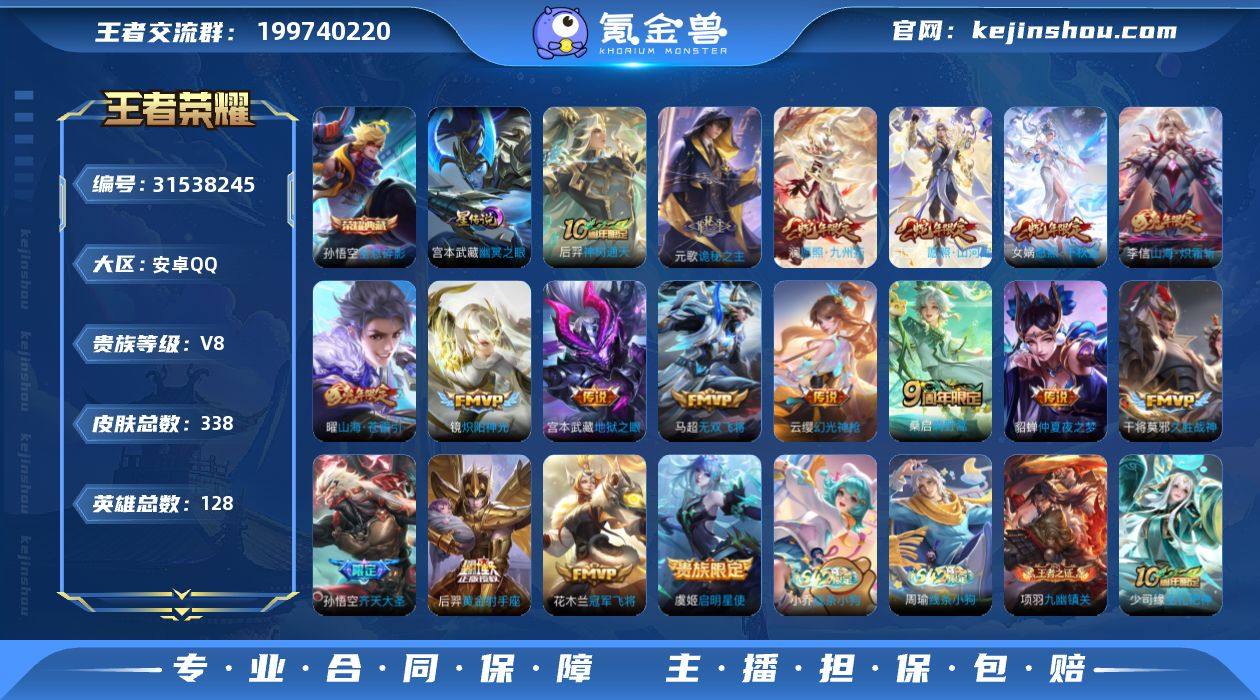 王者成品号,QQ区,贵族V8 皮肤总数:338个 荣耀典藏:1个 传说皮肤:18个 史诗皮肤:101个 稀有限定:至尊宝 内测皮肤:2个 英雄差1个满英雄,铭文全满级,上手即玩。目前,段位非凡,王者19星 注意:不可二次实名,介意勿拍。 账号本人自用,无违规,无封号记录,安全稳定。 诚心出,可小刀,屠龙刀勿扰,非诚勿扰。