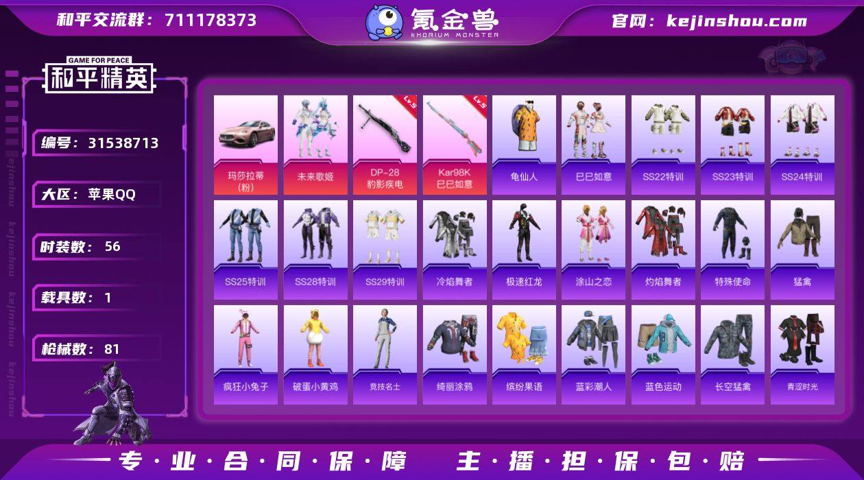 苹果 手Q-1粉装-2特效枪-1载具-0粉色飞行器-25789热力值-2王牌印记-56套装-81枪皮 【热门品类】:套装-龟仙人 【粉色套装】:粉装-未来歌姬 【粉色枪皮等级】:Kar98K-巳巳如意(五级),DP-28-豹影疾电(五级) 【粉色载具】:玛莎拉蒂Ghibli(粉) 【粉色枪皮】:Kar98K-巳巳如意,DP-28-豹影疾电 【粉色降落伞】:至尊龙雀降落伞,风花雪月降落伞,天星战神降落伞,未来歌姬降落伞,变形金刚降落伞,异瞳寒姬降落伞,炫彩糖果降落伞 【稀有套装】:套装-龟仙人,套装-巳巳如意 【稀有枪皮】:AKM-彩虹符号,AKM-破晓战魂,SCAR-L-红色方程式,M416-红色方程式,M416-蓝色火焰,GROZA-懵萌河马,AUG-天降萌叽,AUG-耀粉歌者,QBZ-未来歌姬,M762-天降萌叽,Mk47-妙红点点,G36C-懵萌河马,AC-VAL-天降萌叽,蜜獾-天降萌叽,UZI-红色方程式,UMP45-夜灯,UMP45-涂山之恋,UMP45-诡娃娃,汤姆逊-天降萌叽,P90-巳巳如意,AWM-音爆索尼克,SKS-未来歌姬,VSS-彩虹符号,VSS-绿野极光,Mini14-涂山之恋,莫辛纳甘-懵萌河马,AMR-妙红点点,M417-惊鸿侠骨,M200-惊鸿侠骨,S686-红色方程式,S686-巳巳如意,S12K-破晓战魂,S12K-夜灯,DBS-第五大道,DBS-黑白懵懵牛,M249-妙红点点,M249-百万伏特,M249-糯团青竹,M249-莲影清波,DP-28-彩虹符号,MG3-妙红点点,MG3-幻世战舞者,MG3-惊鸿侠骨,MG3-第五大道,MG3-萝萝小趴兔,PKM-懵萌河马,P18C-百万伏特,TMP-9-未来歌姬,爆炸猎弓-惊鸿侠骨,破片手榴弹-巳巳如意 【其他套装】:套装-SS22特训,套装-SS23特训,套装-SS24特训,套装-SS25特训,套装-SS28特训,套装-SS29特训,套装-冷焰舞者,套装-极速红龙,套装-涂山之恋,套装-灼焰舞者,套装-特殊使命,套装-猛禽,套装-疯狂小兔子,套装-破蛋小黄鸡,套装-竞技名士,套装-绮丽涂鸦,套装-缤纷果语,套装-蓝彩潮...