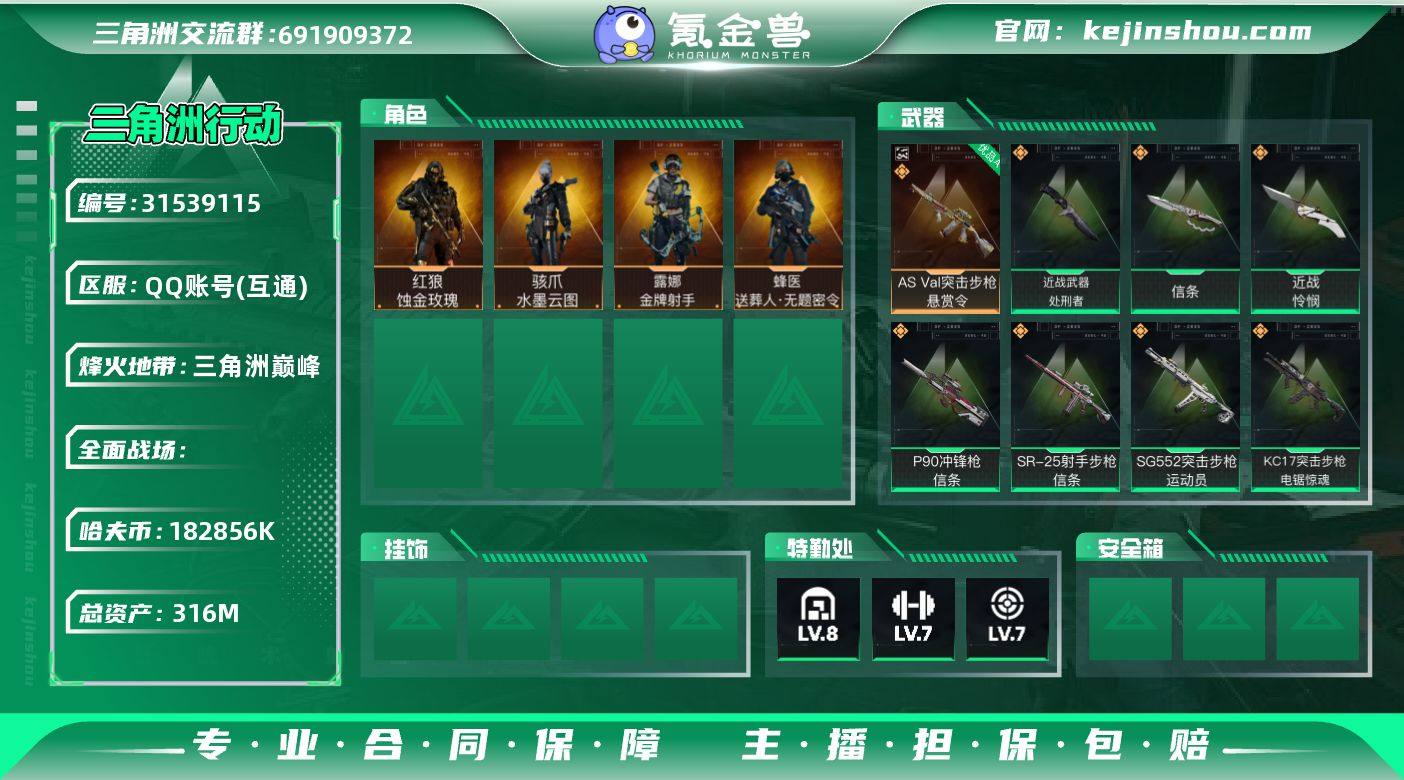 "YXB-纯绿无封-满体满负-182856k哈伏币-总资产316m流动资产275m-60烽火等级-三角洲巅峰-7战场等级-列兵 部门33333特勤处仓库8训练中心7靶场7 【干员外观】:红狼-蚀金玫瑰,骇爪-水墨云图,蜂医-送葬人·无题密令,露娜-金牌射手 【近战皮肤】:近战-信条,近战-怜悯,近战-处刑者,近战-黑鹰 【典藏外观】:AS Val突击步枪-悬赏令优品A 【传说外观】:M4A1突击步枪-蚀金玫瑰,M4A1突击步枪-阿米娅,M7战斗步枪-零度协议,SG552突击步枪-运动员,AK-12突击步枪-特斯拉线圈,SCAR-H战斗步枪-水墨云图,CAR-15突击步枪-阿米娅,腾龙突击步枪-捞点薯条,KC17突击步枪-电锯惊魂,P90冲锋枪-信条,UZI冲锋枪-特斯拉线圈,SR-3M紧凑突击步枪-特斯拉线圈,勇士冲锋枪-能天使-午夜邮差,725双管霰弹枪-送葬人-无题密令,SR-25射手步枪-信条,AWM狙击步枪-捞点薯条,93R-捞点薯条 【挂饰】:挂饰-黑夜猎手,挂饰-毁灭之源,挂饰-能天使,挂饰-蚀金玫瑰,挂饰-信条,挂饰-崩岩重炮,挂饰-暗行哨兵,挂饰-聚宝盆,挂饰-特斯拉线圈,挂饰-来点薯条,挂饰-晶石幻想,挂饰-雪人,挂饰-阿米娅,挂饰-牛角,挂饰-关山难越,挂饰-紧急撤离,挂饰-麻将 "