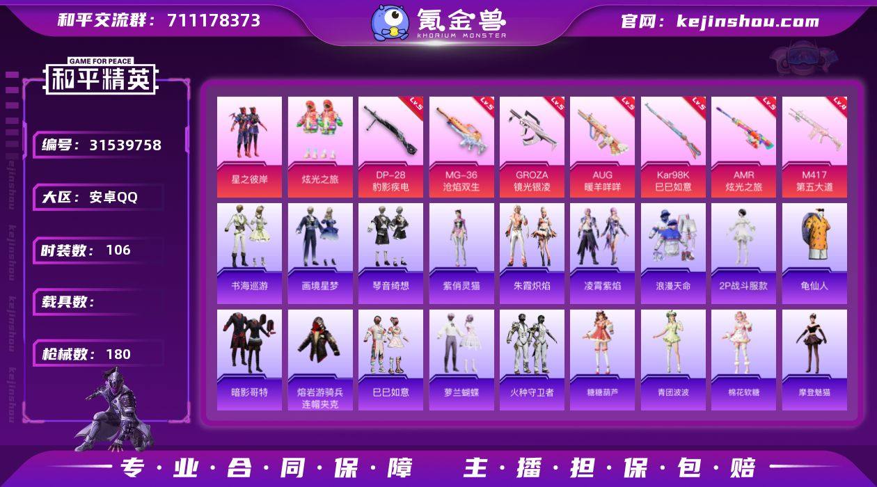 安卓 手Q-2粉装-9特效枪-0载具-3粉色飞行器-49786热力值-5王牌印记-106套装-180枪皮 【热门品类】:套装-浪漫天命,角色-2P战斗服款,套装-龟仙人,套装-暗影哥特,熔岩游骑兵连帽夹克 【粉色套装】:粉装-星之彼岸,粉装-炫光之旅 【粉色枪皮等级】:GROZA-镜光银凌(五级),AUG-暖羊咩咩(五级),AKS-74U-森灵之息(五级),Kar98K-巳巳如意(五级),AMR-炫光之旅(五级),M417-第五大道(四级),DP-28-豹影疾电(五级),MG-36-沧焰双生(五级) 【粉色枪皮】:GROZA-镜光银凌,AUG-暖羊咩咩,AKS-74U-森灵之息,Kar98K-巳巳如意,Mk14-福马献瑞,AMR-炫光之旅,M417-第五大道,DP-28-豹影疾电,MG-36-沧焰双生 【粉色飞行器】:梦幻火箭飞行器,星之彼岸飞行器 【粉色降落伞】:梦幻火箭降落伞,星之彼岸降落伞,第五大道降落伞,萌物绒绒降落伞,炫光之旅降落伞,忍者神龟降落伞,英伦信使降落伞,千金淑猫降落伞,异瞳寒姬降落伞 【稀有套装】:套装-龟仙人,套装-巳巳如意,套装-萝兰蝴蝶,套装-火种守卫者,套装-糖糖葫芦,套装-青团波波,套装-棉花软糖,角色-摩登魅猫,套装-燕燕于飞,套装-鱼渊荷华,套装-朱霞炽焰,套装-凌霄紫焰,角色-紫俏灵猫,套装-书海巡游,套装-画境星梦,套装-琴音绮想,套装-雨过天青,套装-红釉青花 【稀有枪皮】:AKM-2P战斗服款,AKM-彩虹符号,AKM-星之彼岸,AKM-破晓战魂,AKM-龙的传人,M16A4-红色方程式,M16A4-千金淑猫,SCAR-L-夜灯,SCAR-L-炫彩节奏,SCAR-L-玉兔迎春,SCAR-L-红色方程式,M416-圣诞惊喜,M416-糯团青竹,M416-红色方程式,M416-蓝色火焰,GROZA-懵萌河马,AUG-天降萌叽,AUG-耀粉歌者,AUG-月影灵韵,QBZ-彩虹符号,M762-天降萌叽,M762-彩虹符号,M762-第五大道,Mk47-妙红点点,Mk47-炫光之旅,G36C-懵萌河马,AC-VAL-天降萌叽,蜜獾-天降萌叽,ACE32-画...