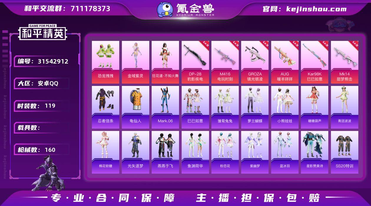 安卓 手Q-3粉装-6特效枪-0载具-0粉色飞行器-46075热力值-2王牌印记-119套装-160枪皮 【热门品类】:套装-忍者信条,套装-龟仙人,角色-Mark.06 【粉色套装】:粉装-恐龙拽拽,角色-金域紫灵,角色-狂花道·不知火舞 【粉色枪皮等级】:M416-电玩时刻(五级),GROZA-镜光银凌(五级),AUG-暖羊咩咩(五级),Kar98K-巳巳如意(五级),Mk14-甜梦熊击(五级),DP-28-豹影疾电(五级) 【粉色枪皮】:M416-电玩时刻,GROZA-镜光银凌,AUG-暖羊咩咩,Kar98K-巳巳如意,Mk14-甜梦熊击,DP-28-豹影疾电 【粉色降落伞】:垂柳戏鸭降落伞,仲夏莫吉托降落伞,萌物绒绒降落伞,精灵梦叶罗丽降落伞,忍者神龟降落伞,星穹咏叹调降落伞,幻彩电音降落伞 【稀有套装】:套装-龟仙人,套装-巳巳如意,套装-雏菊兔兔,套装-萝兰蝴蝶,套装-小熊娃娃,套装-糖糖葫芦,套装-青团波波,套装-棉花软糖,角色-光矢逐梦,套装-燕燕于飞,套装-鱼渊荷华,套装-粉恋花,套装-紫幽梦,套装-蓝冰羽,套装-星影赞美诗 【稀有枪皮】:AKM-破晓战魂,AKM-萌趣颜团子,AKM-龙的传人,M16A4-幻世战舞者,M16A4-千金淑猫,SCAR-L-玉兔迎春,SCAR-L-红色方程式,SCAR-L-冷漠罗丽,M416-糯团青竹,M416-红色方程式,M416-蓝色火焰,GROZA-彩虹符号,GROZA-黑色刀锋,AUG-天降萌叽,AUG-耀粉歌者,QBZ-彩虹符号,M762-彩虹符号,M762-牛气冲天,Mk47-妙红点点,G36C-星穹咏叹调,AC-VAL-天降萌叽,AC-VAL-彩虹甜喵,AC-VAL-快闪甜心,蜜獾-天降萌叽,蜜獾-娇憨猪猪,UZI-天降萌叽,UZI-娇憨猪猪,UMP45-仲夏莫吉托,UMP45-涂山之恋,UMP45-蓝色火焰,Vector-焰鹰斗篷,Vector-生命誓言,汤姆逊-天降萌叽,汤姆逊-炫彩节奏,汤姆逊-耀粉歌者,P90-快闪甜心,P90-巳巳如意,Kar98K-王子的夏天,Kar98K-红色方程式,M24-影袭,AWM-焰鹰斗篷,SKS-炫彩节奏,VSS-星...