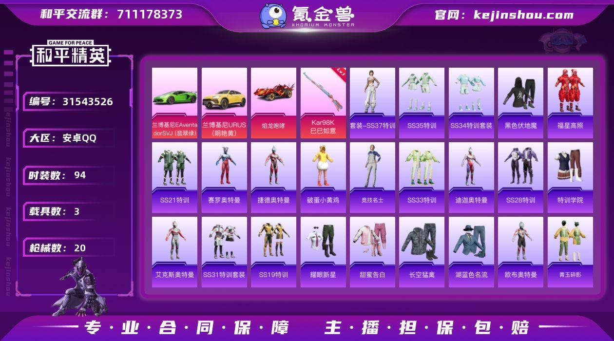 实名:不可二次实名 是否支持人脸包赔:不支持 特效枪数量:1 载具数:3 时装数:94 枪械数:20 一级Kar98K-巳巳如意 兰博基尼Aventador SVJ(翡翠绿),兰博基尼URUS(明艳黄),焰龙咆哮 SS37特训,SS35特训,SS34特训套装,艾克斯奥特曼,长空猛禽,迪迦奥特曼,福星高照,湖蓝色名流,黑色伏地魔,捷德奥特曼,竞技名士,欧布奥特曼,破蛋小黄鸡,青玉碎影,赛罗奥特曼,SS19特训,SS21特训,SS28特训,SS31特训套装,SS33特训套装,甜蜜告白,特训学院,耀眼新星 卖家说:与暗区突围连体号