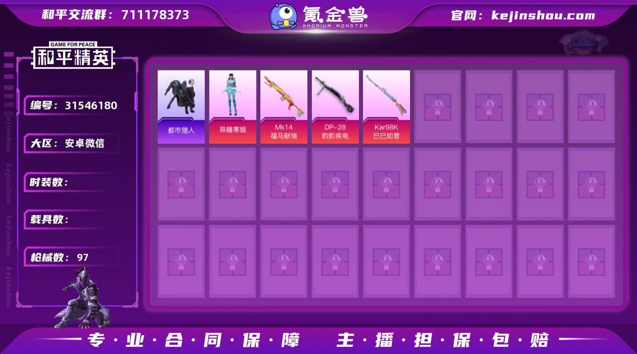 【0载具 3特效枪 1粉装 97枪皮 68套装】套装-都市猎人,角色-异瞳寒姬,Kar98K-巳巳如意,Mk14-福马献瑞,DP-28-豹影疾电,编号:JJELY11