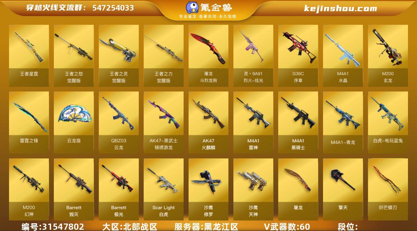 北部战区(黑龙江区)lb【精美爆破号】60v【M200-幻神+四皮(宠儿-2021MVP+N9-2022MVP+电流骇客+黄忠),M200-竞技荣光,王者星霆,云龙套装,ScarLight-白虎,M14EBR-玄武,M4A1-青龙,白虎-电玩蓝兔,COP 357-云龙,炽芒蝶刃,MK5-炽火炎龙,Colt1911-大黄蜂,金刚伞-电玩红兔】4王者【王者星霆,王者之力,王者之怒,王者之灵】3角色【电竞教官-云悠悠,雨棠,斗烈龙骑,职业选手】4音效【M4A1-黑龙音效卡,M4A1-黑骑士音效卡,屠龙-斗烈龙驹-斗烈音效卡】24皮【幻神-宠儿-2021MVP,幻神-N9-2022MVP,幻神-电流骇客,幻神-黄忠,黑骑士-白马银枪,屠龙-星火燎原,雷神-宇航兔,火麒麟-盘古,M4A1-战神赵云,雷神-宠儿-2019MVP,毁灭-战神张飞,毁灭-AG-CFPLS15冠军,毁灭-BEAN-2020MVP,雷神-传奇N9,雷神-荣耀之魄,修罗-冠军之魂,火麒麟-AG战队】vip2截图展示段位不代表实际段位 如赛季更新等不可抗拒因素发生变化、时限道具不保证所剩时间