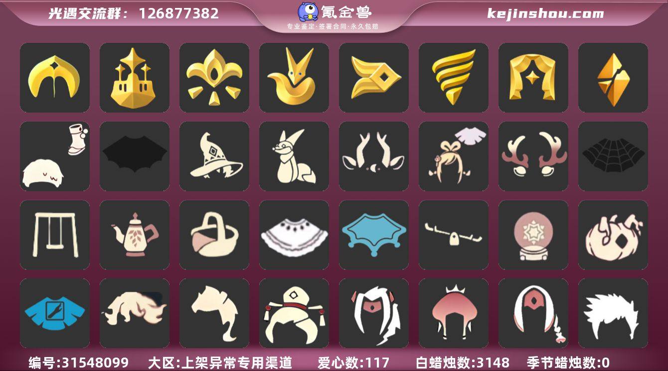 有蝙蝠斗、巫师、绊爱、圣诞鹿角、瑞雪斗篷、秋千、跷跷板、小船、情人节礼包、小王子星球斗、九色鹿、茶桌,全常驻,3000白蜡/200爱心/180红蜡,官服可换绑,可小刀,连体逆水寒5副本白发1天赏头。