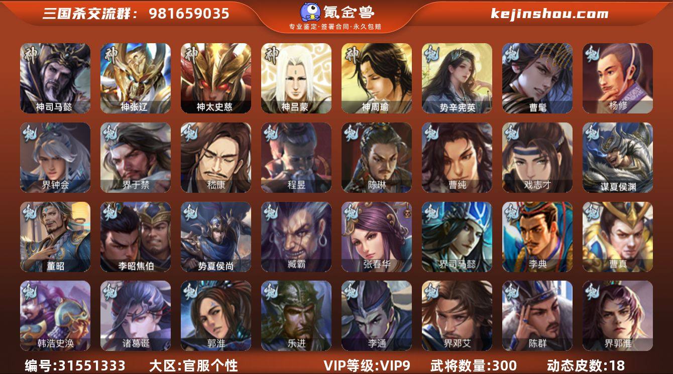 VIP等级: VIP11 官阶: 大将军 武将数量: 358 动态皮肤数量: 29 神将: 神甘宁,神郭嘉,神刘备,神太史慈,神荀彧,神张辽,神赵云,神吕蒙,神周瑜,神诸葛亮 魏国武将: 戏志才,曹纯,曹婴,程昱,嵇康,界曹真,界钟会,司马师,王元姬,文鸯,杨修,徐庶,张辽,SP蔡文姬,SP曹仁,SP关羽,SP贾诩,SP姜维,SP庞德,卞夫人,曹昂,曹操,曹冲,曹洪,曹丕,曹仁,曹叡,曹嵩,贾逵,王异,张恭,鲁芝,界满宠,界曹植,满宠,荀攸,王基,钟繇,郭嘉,荀彧,阮慧,杜畿,界郭嘉,崔琰,界荀彧,朱灵,吕虔,界王异,界许褚,界郭淮,华歆,陈群,界邓艾,界曹休,袁涣,乐进,辛宪英,郭淮,毛玠,郭皇后,夏侯惇,曹植,司马朗,谋于禁,界曹操,星周不疑,许褚,界张辽,谋徐晃,张郃,钟会,文聘,曹彰,界夏侯惇,诸葛诞,司马懿,甄姬,界徐晃,徐晃,孙资刘放,韩浩史涣,胡班,曹真,谋曹丕,典韦,谋荀彧,夏侯渊,李典,于禁,王双,邓艾,界司马懿,张春华,臧霸,牛金,朱灵(国战),李昭焦伯,董昭 蜀国武将: 董允,花鬘,沙摩柯,王平,谋马超,谋赵云,谋黄月英,徐庶,杨仪,吕凯,界关羽,界诸葛亮,邓芝,界伊籍,费祎,严颜,界黄月英,界张嶷,赵云,张松,彭羕,李丰,界刘备,谋法正,界刘禅,谋姜维,刘封,糜竺,李遗,谋庞统,黄月英,刘巴,关羽,吴懿,界廖化,祝融,张飞,黄皓,魏延,界周仓,马忠,界法正,糜夫人,刘禅,界赵云,谋诸葛亮,界姜维,张翼,关银屏,SP孙尚香,SP徐庶,卧龙诸葛,周仓,简雍,界关兴张苞,诸葛亮,界张飞,法正,赵统赵广,陈到,界马岱,关平,马岱,界庞统,庞统,诸葛果,谋张飞,马谡,马超,霍峻,廖化,关兴张苞,孟获,夏侯氏,姜维,黄忠,刘备,界马超,李严,马良,蒋琬费祎,刘谌,彭羕(国战),甘夫人,SP甘夫人 吴国武将: 界步练师,界徐盛,骆统,孙寒华,文鸯,界朱桓,潘濬,周泰,全琮,吕蒙,诸葛恪,界孙尚香,界顾雍,大乔小乔,桥公,谋周瑜,许贡,丁奉,谋吕蒙,界全琮,孙茹,蒋钦,顾雍,阚泽,孙亮,界朱治,孙休,严畯,界孙权,祖茂,濮阳兴,界虞翻,界吕蒙...