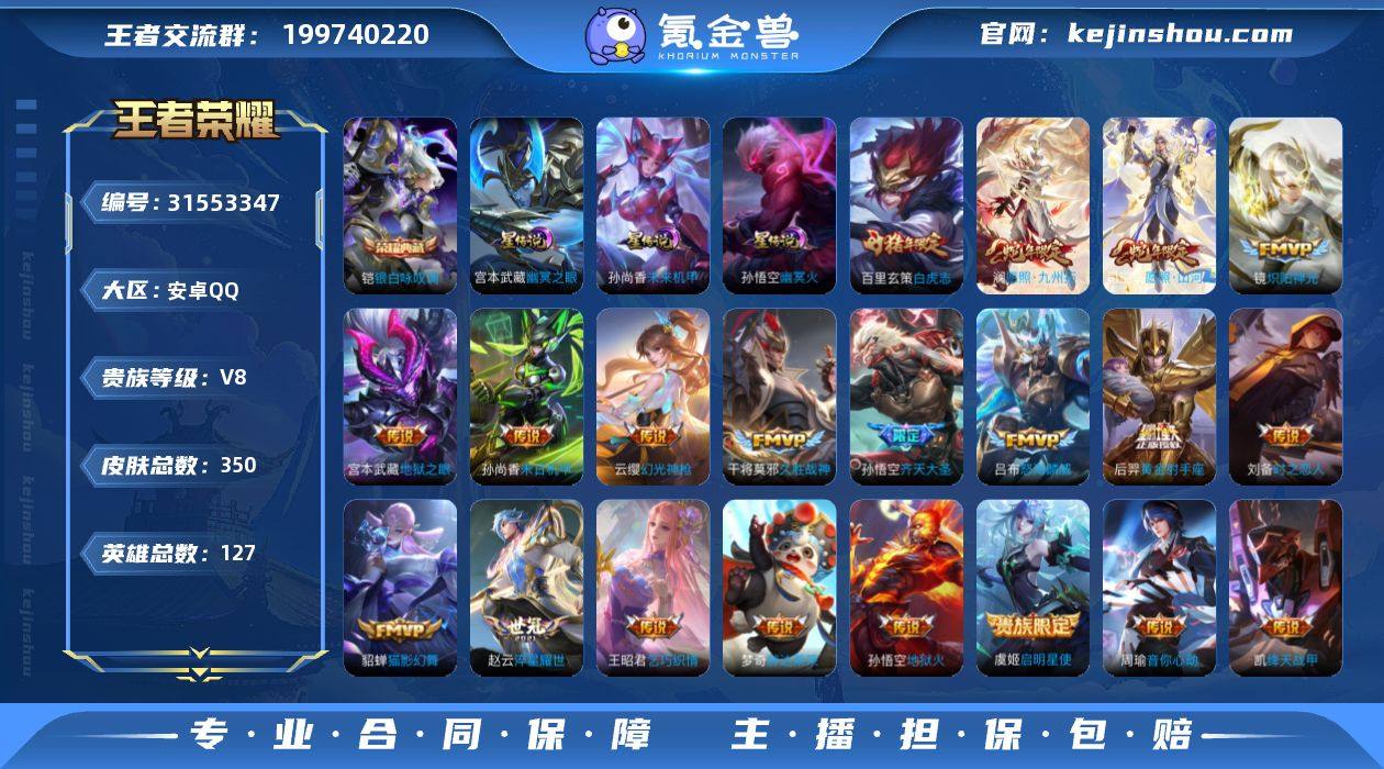 V8 1典藏 1无双 22传说 3星元 350皮肤 127英雄 【1水晶】铠-银白咏叹调【1无双】【22传说】孙悟空-齐天大圣,百里玄策-白虎志,貂蝉-猫影幻舞,干将莫邪-久胜战神,宫本武藏-地狱之眼,后羿-黄金射手座,镜-炽阳神光,铠-绛天战甲,刘备-时之恋人,梦奇-胖达荣荣,孙尚香-末日机甲,孙悟空-地狱火,王昭君-乞巧织情,虞姬-启明星使,赵云-淬星耀世,周瑜-音你心动,吕布-怒海麟威,云缨-幻光神枪,司空震-愿照·山河定,澜-愿照·九州拓,后羿-神树通天【3星元】孙尚香-未来机甲,孙悟空-幽冥火,宫本武藏-幽冥之眼【81史诗】元歌-无心,鬼谷子-五谷丰年,赵云-未来纪元,钟无艳-超时空战士,阿轲-节奏热浪,阿轲-迷踪丽影,安琪拉-心灵骇客,白起-星夜王子,百里守约-特工魅影,百里玄策-原初追逐者,不知火舞-魅语,蔡文姬-舞动绿茵,曹操-幽灵船长,蔡文姬-繁星吟游,程咬金-功夫厨神,妲己-女仆咖啡,妲己-魅力维加斯,大乔-猫狗日记,狄仁杰-魔术师,狄仁杰-鹰眼统帅,貂蝉-圣诞恋歌,伽罗-箭羽风息,干将莫邪-冰霜恋舞曲,宫本武藏-鬼剑武藏,关羽-冰锋战神,韩信-飞衡,花木兰-水晶猎龙者,花木兰-默契交锋,黄忠-烈魂,橘右京-修罗,兰陵王-暗隐猎兽者,兰陵王-驯魔猎人,老夫子-航海奇遇记,李白-千年之狐,李元芳-逐浪之夏,李元芳-银河之约,廉颇-地狱岩魂,刘邦-德古拉伯爵,刘禅-绅士熊喵,刘禅-天才门将,露娜-紫霞仙子,鲁班七号-狮舞东方,吕布-圣诞狂欢,吕布-末日机甲,马可波罗-暗影游猎,蒙犽-狂想玩偶喵,米莱狄-胡桃异想国,墨子-金属风暴,上官婉儿-梁祝,裴擒虎-李小龙,司马懿-暗渊魔法,孙策-猫狗日记,孙尚香-水果甜心,孙悟空-至尊宝,王昭君-凤凰于飞,王昭君-偶像歌手,夏侯惇-乘风破浪,项羽-霸王别姬,小乔-缤纷独角兽,雅典娜-黎明之约,杨玉环-遇见飞天,杨戬-天秀·启明,嬴政-摇滚巨星,嬴政-暗夜贵公子,虞姬-霸王别姬,嬴政-白昼王子,元歌-云间偶戏,张飞-乱世虎臣,赵云-...