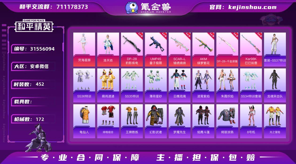 实名:不可二次实名 是否支持人脸包赔:不支持 粉装数量:2 特效枪数量:6 时装数:452 枪械数:172 洛天依,荧海星豚 五级DP-28-豹影疾电,五级AKM-绿萝繁花,五级DP-28-千金淑猫,五级Kar98K-巳巳如意,五级SCAR-L-锦绣绵绵,五级UMP45-量子极限 SS37特训,SS36特训,炫彩糖果,萌鸡速递,SS35特训,薄荷星砂,云魄琉璃,凌霄紫焰,SS34特训套装,朱霞炽焰,8号机,冰川特警,白糯汤圆,白色伏地魔,春光漫游,长空猛禽,创世·幻影,纯真浪花,顶瓜瓜,大橘大利,都市魅力,电音精灵,绯格组合,瑰梦爱神,龟仙人,光之冒险,华灯初上,海岛探路者,湖蓝色名流,黑色伏地魔,黄色伏地魔,黄色名流,黄色运动,红色运动,幻世战舞者,和煦暖阳,幻羽潜行,幻影武者,绝对偶像,酒红色名流,惊鸿侠骨,橘黑制服,竞技达人朋克,竞技角斗士,竞技名士,坚韧舞者,极速红龙,街头潮人,锦衣飞扬,空岛之星,快闪甜心,蓝彩潮人,龙的传人,灵公主,龙魂突击队,猎鹰,龙舌兰冰茶,蓝色运动,冷焰舞者,Mark.06,猛禽,魅力单车,懵萌河马,梦魇先生,霓虹街区,柠萌假日,牛气冲天,破蛋小黄鸡,破晓战魂,轻风白浪,绮丽涂鸦,青年教官,青玉碎影,荣耀,热情海星,人气偶像,深蓝色名流,沙漠兵团,神气柴柴,SS19特训,SS20特训,SS21特训,SS22特训,SS23特训,SS24特训,SS25特训,SS26特训,SS27特训,SS28特训,SS29特训,SS30特训套装,SS31特训套装,SS32特训套装,SS33特训套装,探宝勇士,甜蜜告白,甜梦熊熊,涂山之恋,特训学院,铁血战翼,田园牧歌,完美偶像,王牌教练,星梦畅游,星途旅人,熠彩粉晶,耀粉歌者,野性战心,焰鹰斗篷,鱼渊荷华,燕燕于飞,战地督导,灼焰舞者 极意拳锋飞行器,炫彩糖果降落伞,炫彩糖果飞行器,异瞳寒姬降落伞,星空武士飞行器,绯穹魔姬降落伞,黄族统领降落伞,飒粉甜心降落伞,守护天翼降落伞,未来歌姬降落伞 卖家说:双字id,一心想转让,希望有有缘人