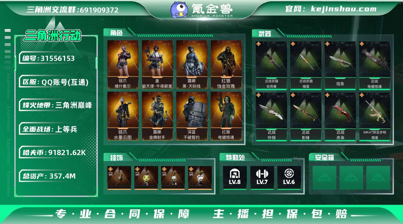 实名:可二次实名 总资产:357.4M 哈夫币:91821.62K 烽火地带段位:三角洲巅峰 烽火地带等级:60 全面战场段位:上等兵 全面战场等级:26 8级仓库,7级训练中心,6级靶场,6级指挥中心,2级潜水中心,3级防具台,3级工作台,3级制药台,3级技术中心,1级收藏室 战术部门等级:3 战斗部门等级:3 医疗部门等级:3 研发部门等级:2 后勤部门等级:2 曼德尔砖-气象感应:0 曼德尔砖-命运王牌:2 曼德尔砖-电玩高手:1 曼德尔砖-美杜莎:0