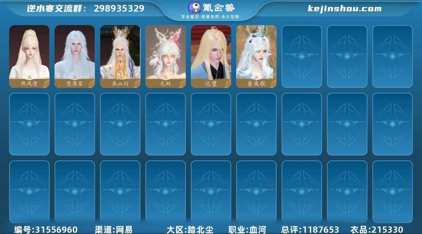 网易支付状态:未注册 换绑冷却:有冷却 职业:血河 总评:1187653 衣品:215330 煦风漫,悲落雪,共山川,无双,沉璧,昼夜歌 卖家说:累充38063