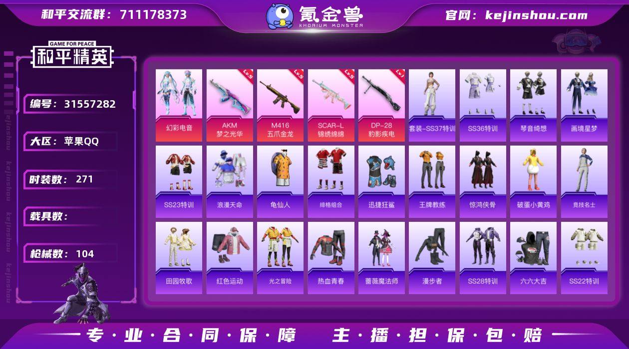 实名:不可二次实名 是否支持人脸包赔:支持 粉装数量:1 特效枪数量:4 时装数:271 枪械数:104 幻彩电音 五级AKM-梦之光华,五级M416-五爪金龙,五级SCAR-L-锦绣绵绵,一级DP-28-豹影疾电 SS37特训,画境星梦,琴音绮想,SS36特训,Alan Walker,暗影哥特,冰冻风暴,缤纷果语,白色伏地魔,春光漫游,长空猛禽,春日漫步,绯格组合,福星高照,龟仙人,光之冒险,虎虎生威吉莉,湖蓝色名流,红色运动,幻世战舞者,酒红色名流,惊鸿侠骨,娇憨猪猪,竞技名士,吉莉礼服,锦衣飞扬,空岛之星,快闪甜心,狂沙舞者,六六大吉,浪漫天命,龙腾端午,冷焰舞者,漫步者,萌黄之夏,魅力单车,萌趣咩咩,萌趣颜团子,霓虹街区,柠萌假日,破蛋小黄鸡,破晓战魂,轻风白浪,蔷薇魔法师,热血青春,SS17特训,SS18特训,SS19特训,SS20特训,SS21特训,SS22特训,SS23特训,SS24特训,SS25特训,SS26特训,SS27特训,SS28特训,田园牧歌,王牌教练,迅捷狂鲨,夏日倾情,银尘,鹰眼刺客,照水倚天 精灵梦叶罗丽降落伞,旋转彩虹降落伞 卖家说:和王者贵族6 传说皮肤11 星元套装2 史诗皮肤21 打野9段 皮肤数量89 英雄121 最强王者