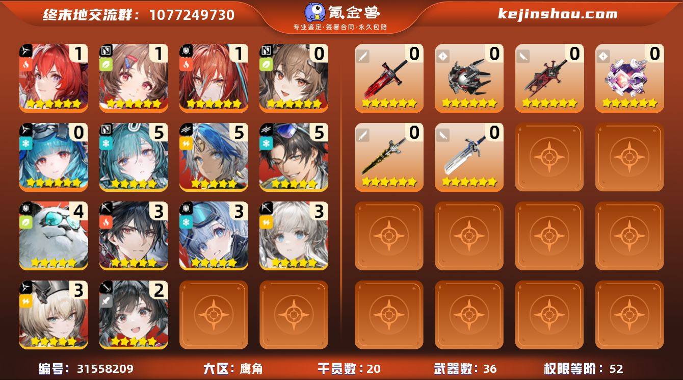 52级账号,谷地12级、武陵6级,两地科技树全部点满 账号内剩余26000嵌晶玉 11莱万汀,01洁尔佩塔,11艾尔黛拉,10余烬,00别礼 共6把6星武器+两个6星武器匣