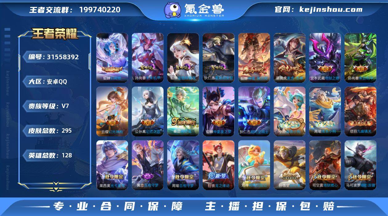 贵族等级:V7 典藏皮肤数:1 珍品无双皮肤数:0 无双皮肤数:0 珍品传说皮肤数:0 传说皮肤数:9 史诗皮肤数:88 皮肤数:295 英雄数:128 段位:非凡王者