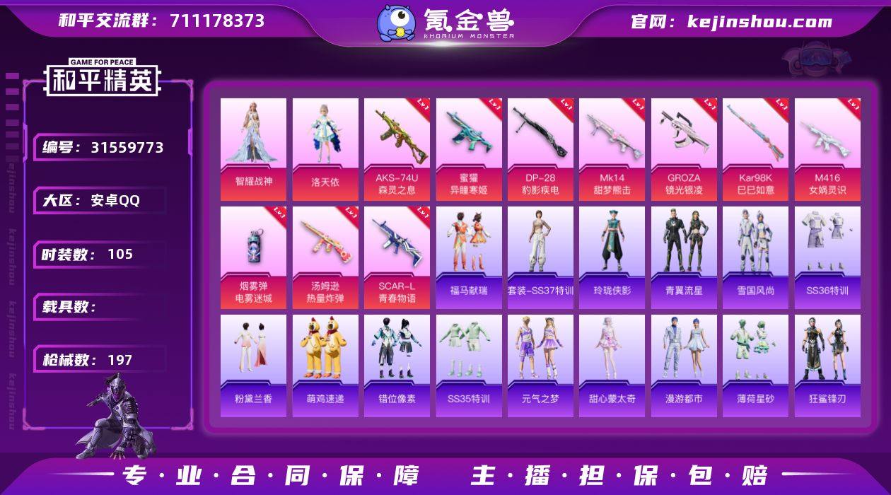 【洛天依M4女娲灵识11特效枪2粉装 秒换绑不用等】 安卓Q区-53092热力值-11印记-105套装-197枪皮 【2粉装】 洛天依 角色-智耀战神【11特效枪】 M416-女娲灵识(3级) AKS-74U-森灵之息(5级) Mk14-福马献瑞(5级) SCAR-L-青春物语(5级) 汤姆逊-热量炸弹(5级) 烟雾弹-电雾迷城(4级) 蜜獾-异瞳寒姬(4级) Kar98K-巳巳如意(5级) Mk14-甜梦熊击(4级) GROZA-镜光银凌(5级) DP-28-豹影疾电(5级)【171热门】 浪漫天命 雪山精英(老6服) 破蛋小黄鸡 白色伏地魔 SS27特训 SS26特训 SS25特训 SS24特训 SS23特训 SS22特训 Mk14-纯梦嫁纱 SCAR-L-玉兔迎春 M762-天降萌叽 M762-彩虹符号 Mk47-乌木金纹 SKS-糯团青竹 UZI-娇憨猪猪 UMP45-蓝色火焰 DBS-彩虹符号 M249-彩虹符号 MG3-幻世战舞者 AKM-虎虎生威 M416-蓝色火焰 GROZA-异彩先驱 长空猛禽 骑行爱好者 妙红点点 懵萌河马 黎明保卫者 坚韧舞者 漫步者 黄色伏地魔 海岛探路者 SKS-青瓷战姬 S1897-糯团青竹 P90-紫矿核心 GROZA-紫矿核心 玲珑侠影 顶瓜瓜 SPAS-12-福马献瑞 冰河战士 MG-36-薄荷星砂 GROZA-福马献瑞 恋语绒绒 SS34特训 漫游都市 蜜獾-鸡智如我 平底锅-宁雨蝶 撬棍-冰晶雪宝 AWM-天降萌叽 福马献瑞 大橘大利 风舞幻音 SS17特训 SS20特训 SS21特训 蓝冰羽 临安公主 龙魂突击队 破片手榴弹-爆破雪人 ACE32-冰晶雪宝 青团波波 鱼渊荷华 青翼流星 萌萌史莱姆 沙漠之鹰-羲和光序 PKM-啾咪啾咪 海盐绵绵冰 M16A4-冰河战士 燕燕于飞 SS31特训 SS33特训 平底锅-梦幻舞会 SS32特训 紫幽梦 极速光影 雪绒豹 游乐 MG3-霓彩脉冲 粉黛兰香 狂鲨锋刃 SS36特训 异域银装 云朵鹅 G36C-星穹咏叹调 野牛-最终圣卫者 M416-糯团青竹