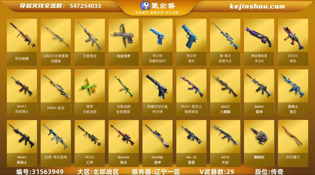 段位:传奇 VIP等级:VIP5 V武器数:29 王者武器数:2 炫金武器数:1 传说幽瞳 QBZ-03-王者蔷薇-觉醒版,王者青龙 炫金修罗 EVOⅢ-萌杀,魂·裁决-胜者为王,柯尔特-萌杀,柯尔特-荣耀世冠EP,神圣爆裂者-末日III,M4A1-赤狱骑士,AWM-昌龙,修罗-古蛇迷踪,金色蔷薇-古蛇迷踪,柯尔特-荣耀世冠白鲨2023,AK47-黑武士-锦绣游龙,AK47-火麒麟,M4A1-雷神,黑骑士-海王,M4A1-黑骑士,白虎-电玩蓝兔,M200-幻神,Barrett-极光,Kar98k-星神,AA-12-雷霆,AK12-天启,麒麟刺,炽芒蝶刃,M200-竞技荣光,柯尔特-竞技荣光,USP-雷暴,擎天-竞技荣光,AK47-B-常胜将军,裁决,柯尔特-冠军之特,G36C-幻影,龙啸-烈火龙威,屠龙-动感闪耀,擎天-云海游龙 王者-魅影 电竞教官-云悠悠,灵动武士,魅影,隼,王者春,鹰,战地猎狐 星神-古蛇迷踪音效卡,云海游龙音效卡,M200-幻神音效卡,M4A1-黑骑士音效卡,M4A1-雷神音效卡,AK47-火麒麟音效卡 卖家说:传说幽瞳满配副武器幻神星神三件套