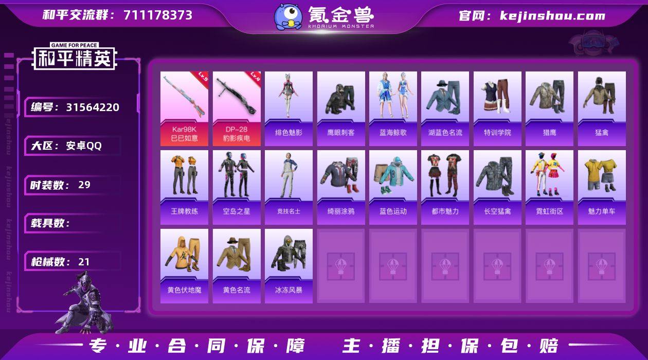 安卓 手Q-0粉装-3特效枪-0载具-0粉色飞行器-7097热力值-2王牌印记-29套装-21枪皮 【粉色枪皮等级】:Kar98K-巳巳如意(五级),DP-28-豹影疾电(四级) 【粉色枪皮】:Kar98K-巳巳如意,DP-28-豹影疾电,信号枪-金乌曜日 【粉色降落伞】:精灵梦叶罗丽降落伞,炫彩糖果降落伞 【稀有套装】:套装-蓝海鲸歌,角色-绯色魅影 【稀有枪皮】:M416-红色方程式,GROZA-影袭,AUG-天降萌叽,QBZ-彩虹符号,短管霰弹-竹节火铳 【其他套装】:套装-湖蓝色名流,套装-特训学院,套装-猎鹰,套装-猛禽,套装-王牌教练,套装-空岛之星,套装-竞技名士,套装-绮丽涂鸦,套装-蓝色运动,套装-都市魅力,套装-长空猛禽,套装-霓虹街区,套装-魅力单车,套装-黄色伏地魔,套装-黄色名流,套装-鹰眼刺客,套装-冰冻风暴 【稀有头盔】:深海小丑鱼头盔(1级) 【营地ID】:1040298636