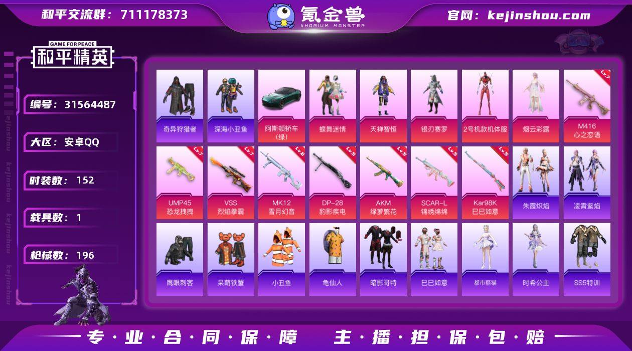 安卓 手Q-5粉装-8特效枪-1载具-4粉色飞行器-69686热力值-10王牌印记-152套装-196枪皮HZ262013013 【热门品类】:套装-深海小丑鱼,套装-小丑鱼,套装-奇异狩猎者,套装-龟仙人,套装-暗影哥特 【粉色套装】:粉装-蝶舞迷情,粉装-天禅智恒,粉装-银刃赛罗,角色-2号机款机体服,角色-烟云彩露 【粉色枪皮等级】:AKM-绿萝繁花(五级),SCAR-L-锦绣绵绵(五级),M416-心之恋语(七级),UMP45-恐龙拽拽(七级),Kar98K-巳巳如意(五级),VSS-烈焰拳霸(七级),MK12-雪月幻音(六级),DP-28-豹影疾电(五级) 【粉色载具】:阿斯顿马丁DBS(绿) 【粉色枪皮】:AKM-绿萝繁花,SCAR-L-锦绣绵绵,M416-心之恋语,UMP45-恐龙拽拽,Kar98K-巳巳如意,VSS-烈焰拳霸,MK12-雪月幻音,DP-28-豹影疾电 【粉色飞行器】:深海曼妙飞行器,炫彩糖果飞行器,齐天大圣飞行器,镜光幻境飞行翼 【粉色降落伞】:深海曼妙降落伞,极限特训降落伞,银河战甲降落伞,四圣焕新降落伞,锦绣火鲤降落伞,香水柠檬降落伞,烈焰拳霸降落伞,洛神天依降落伞,垂柳戏鸭降落伞,太空嘟嘟降落伞,萌酷奶龙降落伞,蜜语绒猫降落伞,绝色倾城降落伞,创世·救赎降落伞,鬼刀降落伞,星穹咏叹调降落伞 【稀有套装】:套装-龟仙人,套装-巳巳如意,角色-都市丽猫,角色-时希公主,套装-朱霞炽焰,套装-凌霄紫焰 【稀有枪皮】:AKM-四圣焕新,AKM-夜灯,AKM-彩虹符号,AKM-影袭,AKM-萌趣颜团子,AKM-虎虎生威,AKM-锦绣火鲤,M16A4-幻世战舞者,M16A4-生命誓言,SCAR-L-炫彩节奏,SCAR-L-玉兔迎春,SCAR-L-王牌四分卫,M416-红色方程式,GROZA-2B战斗服款,GROZA-异彩先驱,GROZA-彩虹符号,GROZA-春暖花开,GROZA-梨园星光,GROZA-治愈之星,GROZA-酷泡奶龙,AUG-怪笑疯兔,AUG-闲梦青缨,QBZ-原初圣火,M762-奇异狩猎者,M762-牛气冲天,M762-瑞龙福将,M762-...