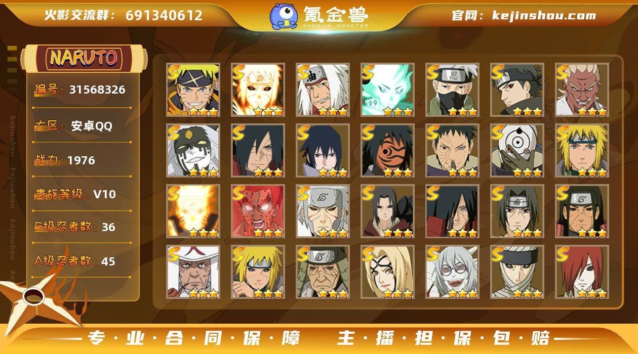 0B2P2H 号 VIP10,1976W战力,S忍37个,A忍48个,本服排名212,战区排名未上榜,通灵兽20个,9时装,点券95,金币5408,高招券16,上忍1阶,忍者星数667