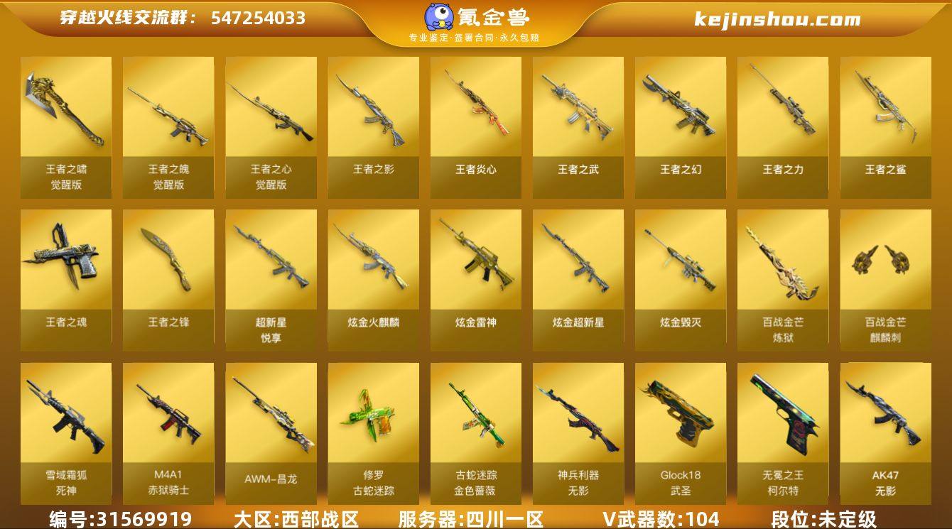 【自带包赔 最高三倍】:西部战区:四川一区-LV100-元首-未定级-104V-18王者武器数-6炫金武器数 【热门武器】:C.A.T,G36C-幻影,加特林-炼狱*6,M200-幻神,M4A1-黑骑士*2,QBZ03-金色蔷薇,Scar Light-白虎,死亡之眼,沙鹰-修罗*2,汤姆逊-烈龙*6,王者炎心,金色蔷薇-古蛇迷踪,修罗-古蛇迷踪 【王者炫金武器】:王者炎心,王者之鲨,王者之幻,王者之武,王者之影,王者之怒*2,王者之力,王者之魂,王者之锋,炫金火麒麟,炫金雷神,炫金武士*2,炫金超新星,炫金毁灭,超新星-悦享 【音效卡】:M200-幻神音效卡,AK47-火麒麟音效卡,M4A1-黑龙音效卡,M4A1-黑骑士音效卡,Barrett-毁灭音效卡,Barrett-极光音效卡,M4A1-雷神音效卡,屠龙-动感闪耀 音效卡,Barrett-碧霄极光音效卡*2,麒麟刺-百战金芒-盛典舞曲音效卡,白虎-盛典舞曲音效卡,炼狱-百战金芒-庆典舞曲音效卡,死神-雪域霜狐-怀旧音效卡,AWM-昌龙-怀旧音效卡 【皮肤】:AWM-天龙-传奇白鲨,幻神-丹凤*2,幻神-CFS2022,火麒麟-轻羽皮肤,火麒麟-平天大圣,毁灭-荣耀之怒,毁灭耀金皮肤,毁灭-冠军之怒,毁灭-CFS2020,黑骑士耀金皮肤,极光-高能霹雳 皮肤,烈龙-星空,雷神-能量核心,雷神-荣耀之魄,雷神-虎将,雷神-耀金皮肤,M4A1-黑龙-361,Scar Light-白虎-暗星,屠龙-荣耀之锋,无影耀金皮肤,AWM-裁决-百城联赛天津皮肤,裁决-羽掣 皮肤,裁决-运输船 皮肤,雷神-暗月,雷神-化蛇 皮肤,M4A1-再燃火线,雷神-神秘按键 皮肤,火麒麟-雷神,毁灭-英雄计划 皮肤,黑龙-能量核心,黑骑士-破界 皮肤,无影-能量核心,战神-粉色甜心皮肤,战神-紫绶金章皮肤*4,战神-流金岁月皮肤,屠龙-惊鸿 皮肤,轻型军用手斧-再燃火线 【角色】:青霞仙子,隼,蜀雪,王者凌霄(四防),樱,战地猎狐,雪域霜狐,蛇隐宗,空,初恋灵狐,电竞少女,...