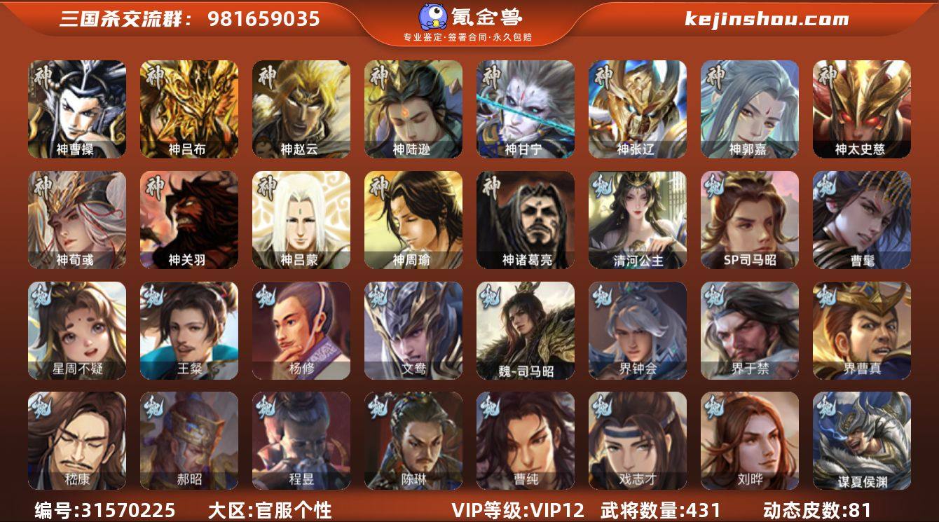 VIP等级: VIP12 官阶: 大将军 武将数量: 431 动态皮肤数量: 81 神将: 神曹操,神甘宁,神郭嘉,神陆逊,神吕布,神太史慈,神荀彧,神张辽,神赵云,神关羽,神吕蒙,神周瑜,神诸葛亮 魏国武将: 刘晔,戏志才,曹纯,陈琳,程昱,郝昭,嵇康,界曹真,界于禁,界钟会,魏-司马昭,文鸯,杨修,王粲,唐咨-魏,张辽,SP蔡文姬,SP曹仁,SP关羽,SP贾诩,SP姜维,SP庞德,卞夫人,蔡贞姬,曹昂,曹操,曹冲,曹洪,曹丕,曹仁,曹叡,王异,张恭,鲁芝,界满宠,曹休,界曹植,满宠,荀攸,王基,钟繇,蒯越蒯良,郭嘉,牵招,荀彧,阮慧,杜畿,界郭嘉,崔琰,界曹丕,界荀彧,朱灵,界甄姬,吕虔,界王异,界许褚,界郭淮,华歆,陈群,界邓艾,界典韦,界曹休,司马孚,袁涣,李通,乐进,辛宪英,郭淮,郭皇后,毌丘俭,夏侯惇,曹植,司马朗,谋于禁,界曹操,星周不疑,许褚,界张辽,谋徐晃,张郃,钟会,文聘,曹彰,界夏侯惇,诸葛诞,司马懿,甄姬,界徐晃,徐晃,孙资刘放,韩浩史涣,曹真,典韦,界夏侯渊,夏侯渊,李典,于禁,王双,邓艾,界司马懿,张春华,孟达-魏,臧霸,牛金,朱灵(国战),曹髦,清河公主,SP司马昭,董昭,谋夏侯渊 蜀国武将: 董允,关索,花鬘,谯周,沙摩柯,王平,张星彩,赵襄,周群,诸葛瞻,谋马超,谋赵云,马云騄,徐庶,界魏延,杨仪,吕凯,界关羽,界诸葛亮,邓芝,界伊籍,费祎,严颜,界黄月英,界张嶷,赵云,张松,彭羕,李丰,界刘备,界刘禅,刘封,糜竺,谋庞统,黄月英,刘巴,关羽,王甫赵累,吴懿,吴班,界吴懿,向宠,祝融,张飞,黄皓,魏延,界周仓,马忠,界法正,糜夫人,界孟获,刘禅,界赵云,界姜维,张翼,关银屏,界祝融,SP孙尚香,SP徐庶,卧龙诸葛,宗预,周仓,简雍,界关兴张苞,诸葛亮,孙乾,界张飞,界卧龙诸葛,法正,赵统赵广,陈到,界马岱,关平,马岱,界庞统,庞统,诸葛果,谋张飞,马谡,马超,霍峻,廖化,关兴张苞,孟获,秦宓,吴苋,夏侯氏,姜维,黄忠,刘备,界马超,李严,马良,傅肜,蒋琬费祎,许靖,刘谌,彭羕(国战),甘夫人,蜀-糜芳傅士仁,势陈到...