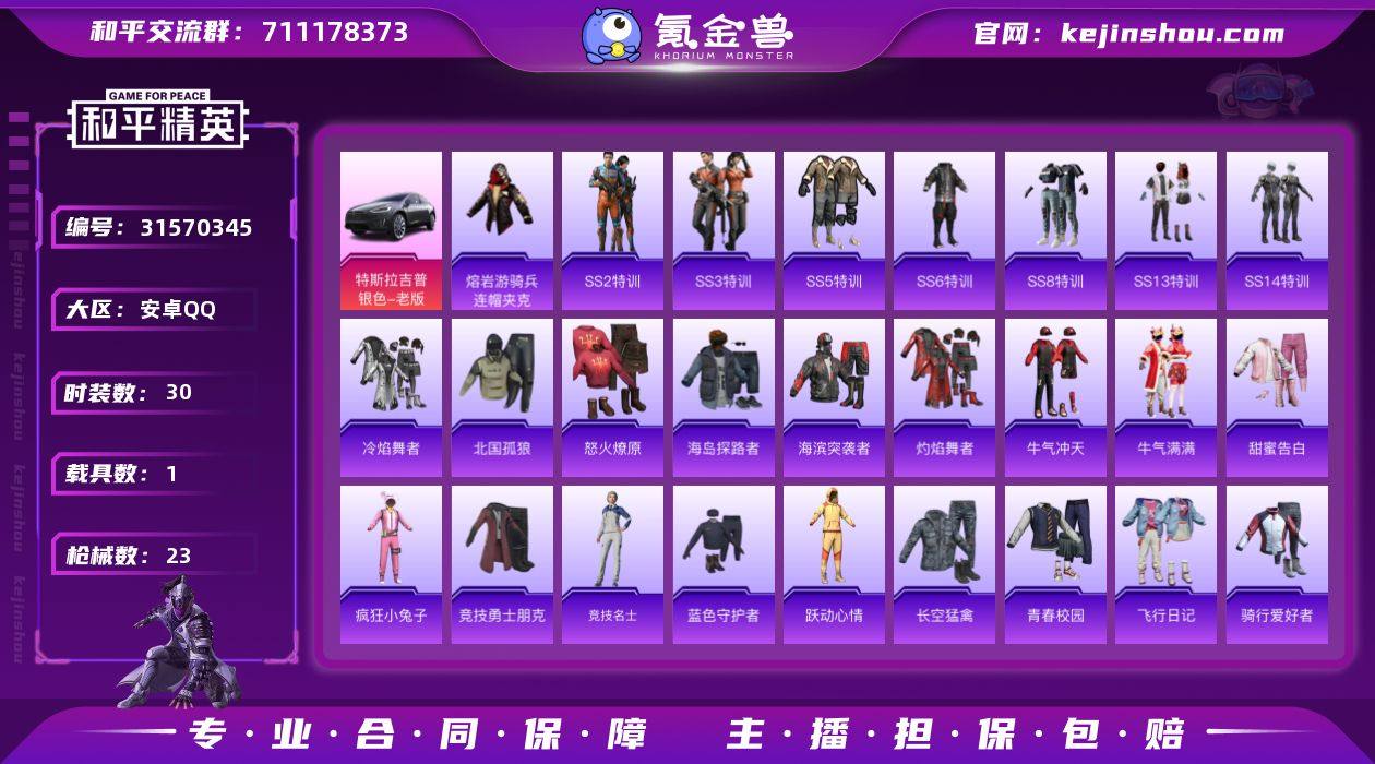 安卓【品质小号/1王牌印记/熔岩游骑兵连帽夹克/特斯拉Model X(冷光银)/0粉装-0特效枪-1载具-0粉色飞行器-9285热力值】 手Q-0粉装-0特效枪-1载具-0粉色飞行器-9285热力值-1王牌印记-30套装-23枪皮 【热门品类】:熔岩游骑兵连帽夹克 【粉色载具】:特斯拉Model X(冷光银) 【粉色降落伞】:凝视深渊降落伞,星穹咏叹调降落伞,幻彩电音降落伞 【稀有枪皮】:AKM-彩虹符号,AKM-破晓战魂,AKM-霓虹街区,SCAR-L-炫彩节奏,SCAR-L-红色方程式,M416-蓝色火焰,AUG-耀粉歌者,QBZ-彩虹符号,M762-天降萌叽,Vector-彩虹符号,Kar98K-红色方程式,S686-生命誓言,S1897-春暖花开,S12K-玩趣呆呆,S12K-破晓战魂,MG3-幻世战舞者 【其他套装】:套装-SS2特训,套装-SS3特训,套装-SS5特训,套装-SS6特训,套装-SS8特训,套装-SS13特训,套装-SS14特训,套装-冷焰舞者,套装-北国孤狼,套装-怒火燎原,套装-海岛探路者,套装-海滨突袭者,套装-灼焰舞者,套装-牛气冲天,套装-牛气满满,套装-甜蜜告白,套装-疯狂小兔子,套装-竞技勇士朋克,套装-竞技名士,套装-蓝色守护者,套装-跃动心情,套装-长空猛禽,套装-青春校园,套装-飞行日记,套装-骑行爱好者,套装-魅力单车,套装-漫步者,套装-战地菁英,套装-夜莺强袭者,套装-雪山精英 【稀有头盔】:深海小丑鱼头盔(1级) 【营地ID】:778395648