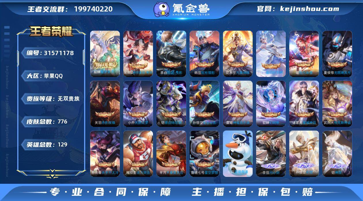 马年新皮肤已经更新,自用号不是贩子商人,打野72段中路69段对抗路64段白起杨戬小乔云缨是国五十等共十九个小国,还有一万五省标马超,一万二省标马克,省标狄仁杰关羽,小星元很多就不细标了,绑着小号lol等其他游戏账号,细节可谈,价格可议