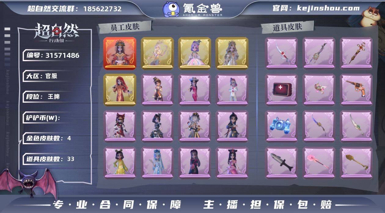 - 红色限定(幻梦级):镜生遗梦(巫铃儿) - 金色限定:莲华渡(逍遥)、圣光之谕(薇薇安)、遗失的童话(小黄)、镜花辞(巫铃儿)、庆宴绮愿(周年限定) - 紫色皮肤:包含罗丽、冰公主、水王子、情公主等热门IP联动皮肤,以及周年限定“耀眼的你”“绒绒对决”等稀有款 - 道具/挂饰/头饰:数量充足,包含小狗蛇点点鞭、凤鸣九天、卡皮巴拉等热门道具