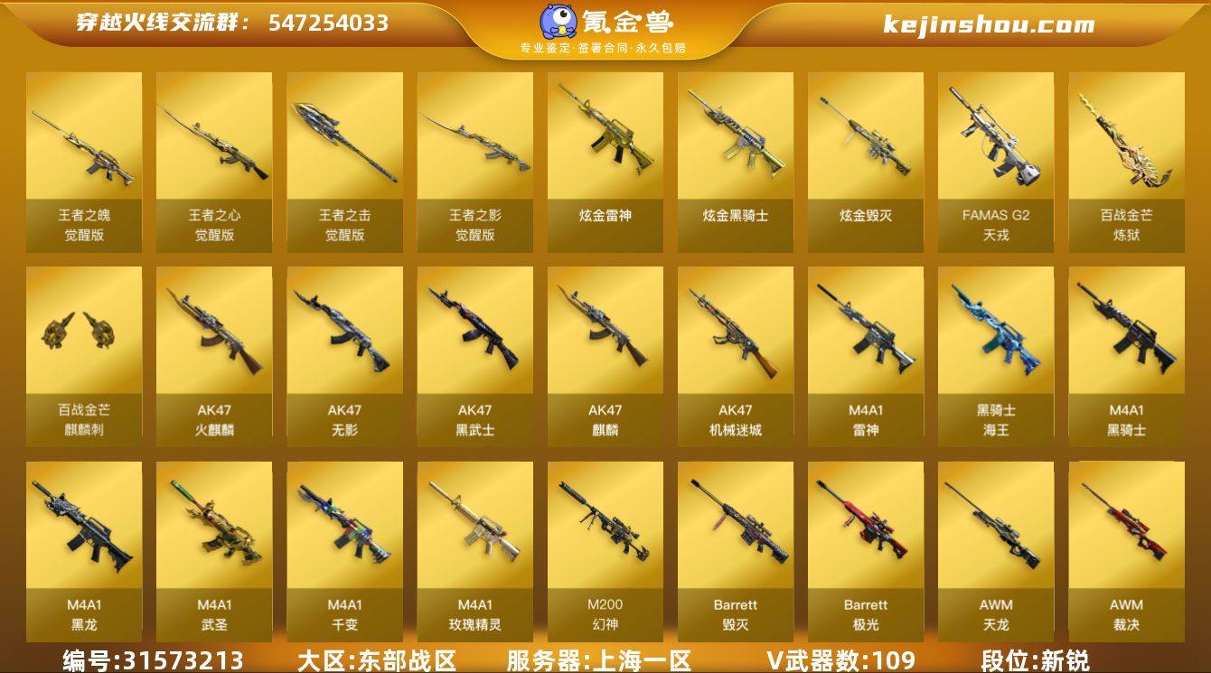 【ky5350】上海一区-118V-6王者武器数-5炫金武器数 【热门武器】:QBZ03-金色蔷薇,Scar Light-白虎,HK417-朱雀,M200-幻神,M200-竞技荣光,死亡之眼,荣耀世冠-火麒麟,M4A1-黑骑士,汤姆逊-烈龙*2,羊驼玩偶,裁决-雪莉杨,USP-雷暴,沙鹰-修罗*3 【王者炫金武器】:炫金骑士*2,炫金雷神,炫金毁灭*2 【音效卡】:AK47-火麒麟音效卡,M4A1-雷神音效卡,M4A1-黑龙音效卡*2,M4A1-黑骑士音效卡,Barrett-毁灭音效卡,Barrett-碧霄极光音效卡,炼狱-百战金芒-庆典舞曲音效卡 【皮肤】:幻神-AG-CFPLS17冠军,幻神-电竞之星 皮肤,白虎-大汉风骨,AWM-裁决-百城联赛天津皮肤,裁决-叶芒苍灵 皮肤,裁决-运输船 皮肤,雷神-暗月,雷神-星空,雷神-虎将,雷神-传奇N9,雷神-R.LGD-CFPLS18冠军,雷神-诺拉 皮肤,M4A1-再燃火线,雷神-神秘按键 皮肤,火麒麟-心动糖果,毁灭-暗月,毁灭耀金皮肤*2,毁灭-星空,毁灭-虹光风暴 皮肤,毁灭-英雄计划 皮肤,黑龙-能量核心,黑骑士-破界 皮肤,极光-能量核心,修罗-能量核心*2,修罗-星空,屠龙-春桃 皮肤,屠龙-惊鸿 皮肤,轻型军用手斧-再燃火线 【角色】:葵,电竞教官-云悠悠,乔伊教练,修道士,暗夜-X,芳心审判者,风暴女,嘉年华灵狐,娟娟,兰-海滩派对,兰妹妹,灵狐者-X,龙儿,潘多拉-甜心教官,青霞仙子,斯沃特-X,蜀雪,铁骑荣耀,雪莉杨,影武者-X 【人偶武器】:裁决-雪莉杨,AWM-灵狐-15周年嘉年华*3,COP-旗袍,迷你深渊冰龙,迷你牛魔王,迷你牛牛,迷你生化手雷,生化手雷-机甲核心,深渊终结者手雷,闪光弹-小乔,迷你超能女侍 【暴走生化】:死亡之眼 【挑战大师】:冰龙粉碎者-白马银枪,激光毁灭者III-白马银枪*2,试炼破坏者III,神圣爆裂者-末日III 【英雄级武器】:M4A1-千变,AK47-火麒麟*2,AK47-麒麟,M4A1-黑龙,M4A1-雷神,M4A1-黑骑士...