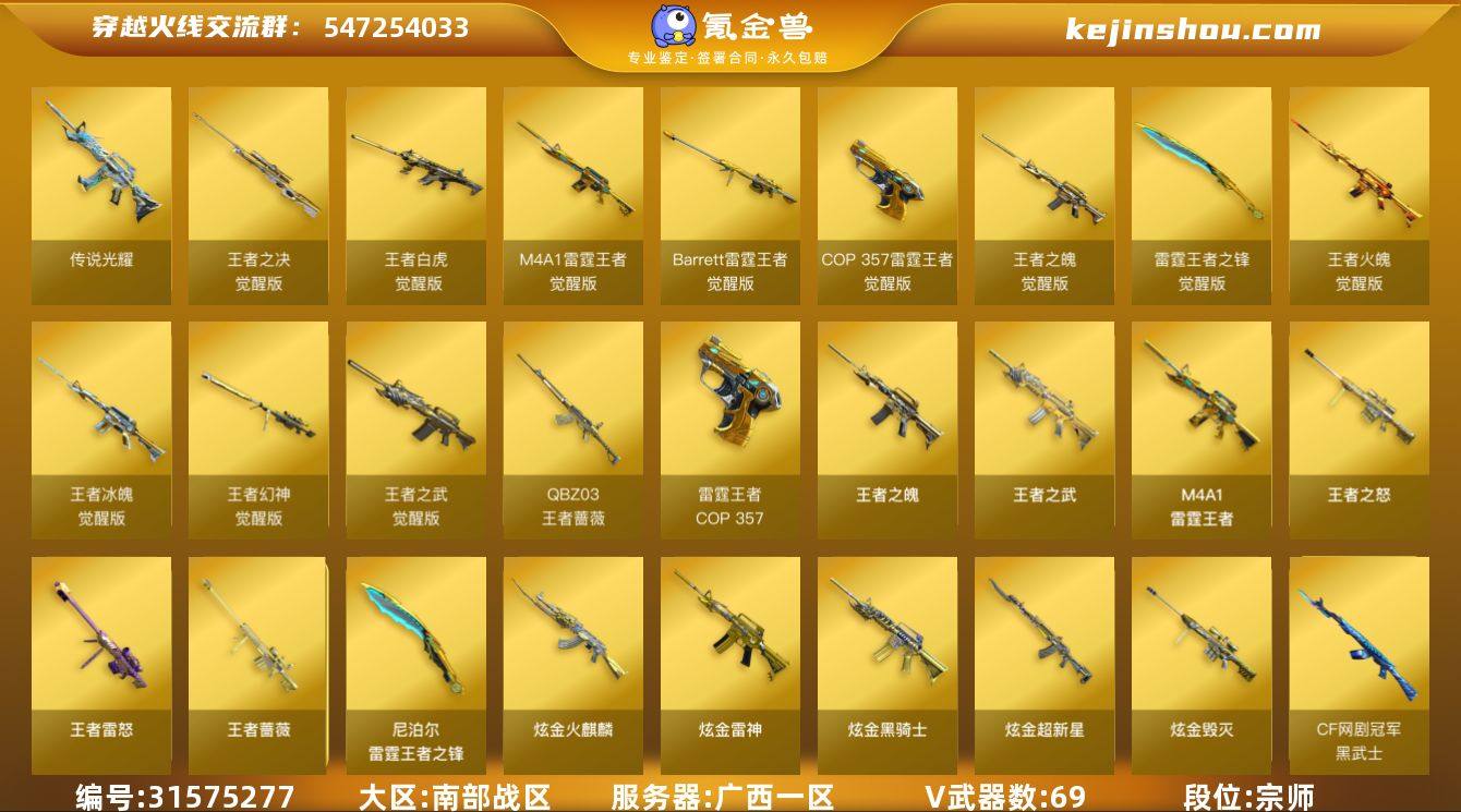 广西一区-88V-28王者武器数-5炫金武器数 【传说武器】:传说光耀 【传说角色】:传说女帝 【热门武器】:传说光耀,M200-幻神,QBZ-03-王者蔷薇,M200-竞技荣光,Kar98K-星神,M4A1-黑骑士,汤姆逊-烈龙*3,雷神-小红,COP-白鲨,USP-雷暴,COP 357-雷霆王者,沙鹰-修罗*4 【王者炫金武器】:王者之武*2,王者之魄,QBZ-03-王者蔷薇,M4A1-雷霆王者,王者之怒,王者蔷薇,王者雷怒,COP 357-雷霆王者,雷霆王者之锋,炫金火麒麟,炫金骑士,炫金雷神,炫金超新星,炫金毁灭 【音效卡】:AK47-火麒麟音效卡,M4A1-黑骑士音效卡,Barrett-毁灭音效卡 【皮肤】:幻神-动感闪耀 皮肤,幻神-纸灯龙皮肤,雷神-暗月,雷神-荣耀之魄,雷神-R.LGD-CFPLS18冠军,雷神-烈虎皮肤,火麒麟-轻羽皮肤,火麒麟-盘古,毁灭耀金皮肤*2,毁灭-星空,毁灭-百城浙江 皮肤,M4A1-黑龙-361,黑骑士耀金皮肤,黑骑士-AG-S4冠军典藏,死神-机甲核心皮肤,战神-粉色甜心皮肤*3,战神-紫绶金章皮肤*13,战神-流金岁月皮肤*12,天龙-能量核心,AWM-天龙-传奇白鲨,极光-能量核心,修罗-冠军之魂,龙啸-青青莓果 皮肤,擎天-秘银,擎天-冠军之击,麒麟刺-荣耀世冠白鲨 【角色】:电竞教官-云悠悠,王者玲珑,王者潘多拉,乔伊教练,暗夜-X,芳心审判者,虎妞,嘉年华灵狐,灵狐者-X,灵狐者-黄金海岸,麻雀,潘多拉-X,潘多拉-甜心教官,蜀雪,铁骑荣耀,兔囡囡,影武者-X,幽 【人偶武器】:雷神-小红,COP-白鲨,天龙-乔伊教练,AWM-灵狐-15周年嘉年华,生化手雷-机甲核心,闪光弹-小乔 【暴走生化】:超级对讲机 【挑战大师】:暴君乱世-超越Max,神圣爆裂者-末日III 【英雄级武器】:AK47-火麒麟*2,M4A1-黑龙,M4A1-雷神*2,M4A1-黑骑士,AN94-超新星,M4A1-猎神,烈火-动感闪耀,王者之武-觉醒版,王者之魄-觉醒版,AK-47-猩红传说*16,A...
