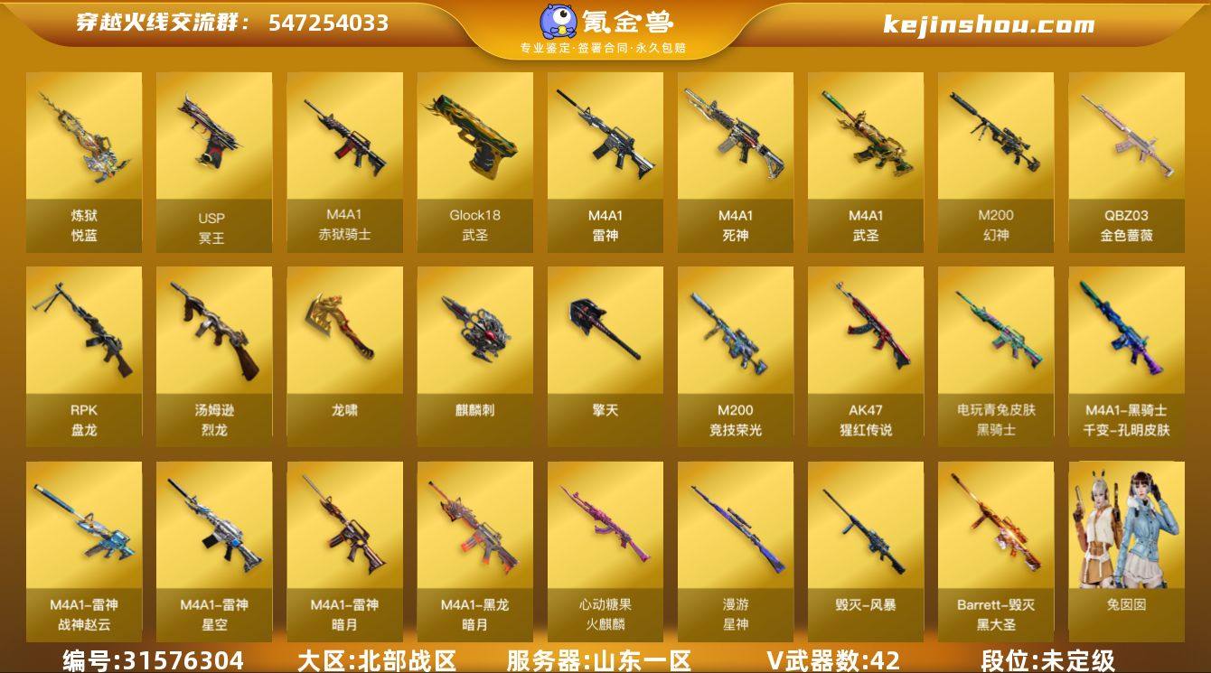 【自带包赔 最高三倍】:北部战区:山东一区-LV100-元帅-未定级--42V-2王者武器数-0炫金武器数 【热门武器】:Kar98K-星神,M200-幻神,M200-竞技荣光,M4A1-黑骑士*3,QBZ03-金色蔷薇,RPK-盘龙,死亡之眼*2,沙鹰-修罗*4,汤姆逊-烈龙 【王者炫金武器】:炼狱-悦蓝 【音效卡】:M4A1-黑骑士音效卡 【皮肤】:毁灭-黑大圣皮肤,火麒麟-心动糖果,毁灭-风暴,雷神-能量核心*2,雷神-星空,M200-幻神-黄忠皮肤,M4A1-战神赵云,星神-漫游,雷神-暗月,毁灭-百城浙江 皮肤,M4A1-千变-孔明皮肤,黑龙-暗月,黑骑士-电玩青兔皮肤,修罗-能量核心*2 【角色】:零,灵动武士,青霞仙子,奇洋探员,乔伊教练,云海玲珑,空,风暴女,虎妞,娟娟,萌儿,潘多拉-X,斯沃特-X,兔囡囡,影武者-X 【人偶武器】:AK47-斯沃特,迷你深渊冰龙,M200-夜玫瑰,深渊终结者手雷 【暴走生化】:死亡之眼*2 【挑战大师】:冰龙粉碎者-白马银枪,激光毁灭者III 【英雄级武器】:AK47-火麒麟*3,AWM-天龙*2,Barrett-毁灭*2,Barrett-极光*2,Glock18-武圣,Kar98K-星神,龙啸,M4A1-黑龙*2,M4A1-雷神,M4A1-黑骑士*3,M4A1-死神,M4A1-武圣,M200-幻神,M200-竞技荣光,擎天,麒麟刺,RPK-盘龙,沙鹰-修罗*4,汤姆逊-烈龙,屠龙*2,QBZ03-金色蔷薇,AK-47-猩红传说,炼狱-悦蓝-觉醒版,USP-冥王,闪光弹-竞技荣光*2,烟雾弹-竞技荣光*2,M4A1-赤狱骑士 道具、段位等以实际验号为准。如账号因没有维护,赛季更新等不可抗因素发生变化,不属于账号质量问题"