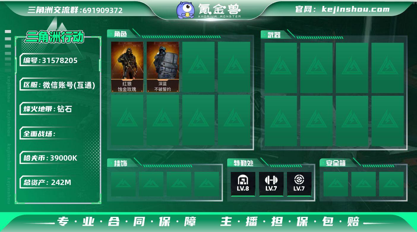实名:可二次实名 总资产:242M 哈夫币:39000K 烽火地带段位:钻石 烽火地带等级:60 全面战场等级:0 8级仓库,7级训练中心,7级靶场,1级潜水中心,0级收藏室 战术部门等级:3 战斗部门等级:2 医疗部门等级:3 研发部门等级:3 后勤部门等级:3