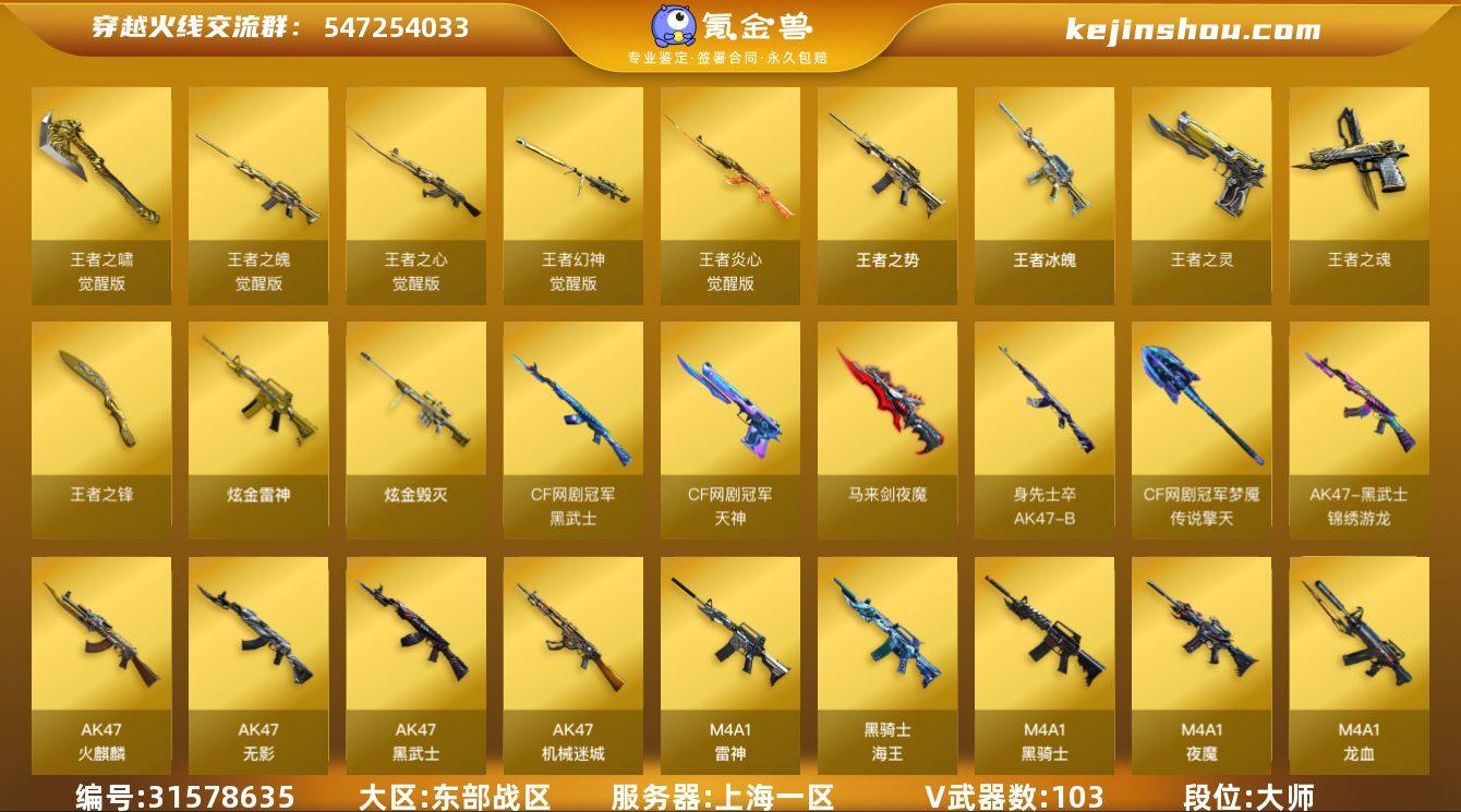 【自带包赔 最高三倍】:东部战区:上海一区-LV.100-大元帅-大师1-103V-14王者武器数-4炫金武器数 【传说武器】:传说光耀 【传说角色】:传说影煞 【热门武器】:传说光耀,炽芒蝶刃*2,HK417-朱雀,加特林-炼狱,Kar98K-星神,M200-幻神,M4A1-黑骑士*3,牛牛-AK47,QBZ03-金色蔷薇,RPK-盘龙*6,Scar Light-白虎,死亡之眼,沙鹰-修罗*3,汤姆逊-烈龙*7 【王者炫金武器】:王者冰魄,王者之势*2,王者之灵*4,王者之魂,王者之锋,炫金骑士*2,炫金雷神,炫金毁灭 【音效卡】:AK47-火麒麟音效卡,M4A1-黑骑士音效卡,Barrett-毁灭音效卡,M4A1-雷神音效卡 【皮肤】:火麒麟-战神关羽,火麒麟-平天大圣,火麒麟-盘古,毁灭耀金皮肤,黑骑士耀金皮肤,雷神-虎将*4,雷神-耀金皮肤,雷神-宇航兔皮肤,无影耀金皮肤,无影-能量核心,战神-粉色甜心皮肤*2,战神-流金岁月皮肤,AK47-B-常胜将军-曹操*2,AK47-B-常胜将军-刘备*2,炼狱-玩具枪皮肤 【角色】:凌霄,青霞仙子,蜀雪,王者-瞳-闭月羞花,王者春,王者玲珑-小乔,王者沙漠玫瑰,奇洋探员,暗夜-X,北极狐-X,风暴女,娟娟,灵狐者-七夕宝贝,曼陀罗-礼服,潘多拉-X,潜龙队-X,雪莉杨 【人偶武器】:COP-旗袍,火麒麟-灵狐,M37-葵,迷你深渊冰龙,迷你超能女侍,牛牛-AK47,闪光弹-小乔,闪光弹-貂蝉 【暴走生化】:死亡之眼 【挑战大师】:AK47-冰龙粉碎者,冰龙粉碎者-白马银枪,激光毁灭者III,VEPR-12-金魔 【英雄级武器】:AK47-火麒麟*2,AK47-无影,AK47-黑武士,AK12-天启*6,AK47-机械迷城,AWM-裁决,Barrett-毁灭,炽芒蝶刃*2,加特林-炼狱,Kar98K-星神,龙啸,M4A1-雷神,M4A1-黑骑士*3,M4A1-龙血,M4A1-夜魔,M4A1-猎神,M200-幻神,马来剑-夜魔,破空枪刃-夜魔*2,麒麟刺*2,RPK-盘龙*6,沙鹰-修罗*3,汤姆逊-烈龙*7,屠龙*...