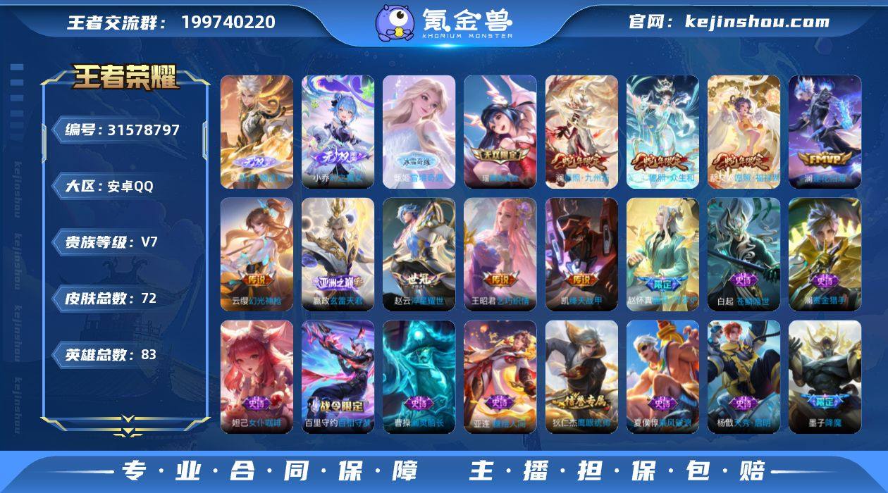 AL678609 【皮肤质量高 蛇年天暮】 皮肤数72 无双皮肤数4 传说皮肤数9 史诗皮肤数19 英雄数83 营地id1614578185 贵族等级【文本】贵族7级 【贵族7级】 无双皮肤4 年限皮肤3 限定皮肤19 赛季限定2 史诗皮肤19 战令限定4 勇者皮肤26 其他皮肤14 无双皮肤:小乔时之魔女,曜器灵螭龙剑,瑶真我赫兹,甄姬雪境奇遇; 年限皮肤:蔡文姬愿照福禄聚,澜愿照九州拓,妲己愿照众生和; 限定皮肤:蔡文姬愿照福禄聚,澜愿照九州拓,妲己愿照众生和,赵怀真器灵浮梦炉,墨子降魔,狄仁杰鹰眼统帅,甄姬雪境奇遇,狄仁杰阴阳师,狄仁杰魔术师,嬴政玄雷天君,马超访茗客,孙膑茶境仙,太乙真人谧流熔炉,赵云皇家上将,老夫子百相守梦,百里守约百相守梦,项羽海滩派对,东皇太一噬灭天穹,吕布逐霄战戟; 赛季限定:太乙真人谧流熔炉,东皇太一噬灭天穹; 史诗皮肤:貂蝉圣诞恋歌,亚连糖绘人间,曹操幽灵船长,夏侯惇乘风破浪,赵怀真器灵浮梦炉,钟馗乐园奇幻夜,墨子降魔,王昭君偶像歌手,狄仁杰鹰眼统帅,白起苍鳞隐世,澜赏金猎手,狄仁杰魔术师,嬴政暗夜贵公子,孙膑茶境仙,墨子金属风暴,杨戬天秀启明,妲己女仆咖啡,赵云皇家上将,百里守约百相守梦; 战令限定:马超访茗客,孙膑茶境仙,老夫子百相守梦,百里守约百相守梦; 勇者皮肤:戈娅玫蓝誓约,王昭君幻想奇妙夜,明世隐景韶洛都,蒙犽胡桃狂想曲,达摩爆裂喵拳,少司缘灵卦秘语,东皇太一金福满堂,白起白色死神,西施雪境奇遇,姜子牙时尚教父,狄仁杰阴阳师,典韦铁骨偃魂,马超访茗客,影魅影绮裳,太乙真人谧流熔炉,苍苍林狼骑,蒙恬蔚蓝守将,韩信街头霸王,杨戬次元傲视,关羽龙腾万里,老夫子百相守梦,项羽海滩派对,东皇太一噬灭天穹,干将莫邪雾都夜雨,吕布逐霄战戟,宫本武藏未来纪元; 其他皮肤:马可波罗激情绿茵,盾山极冰防御线,金蝉前...
