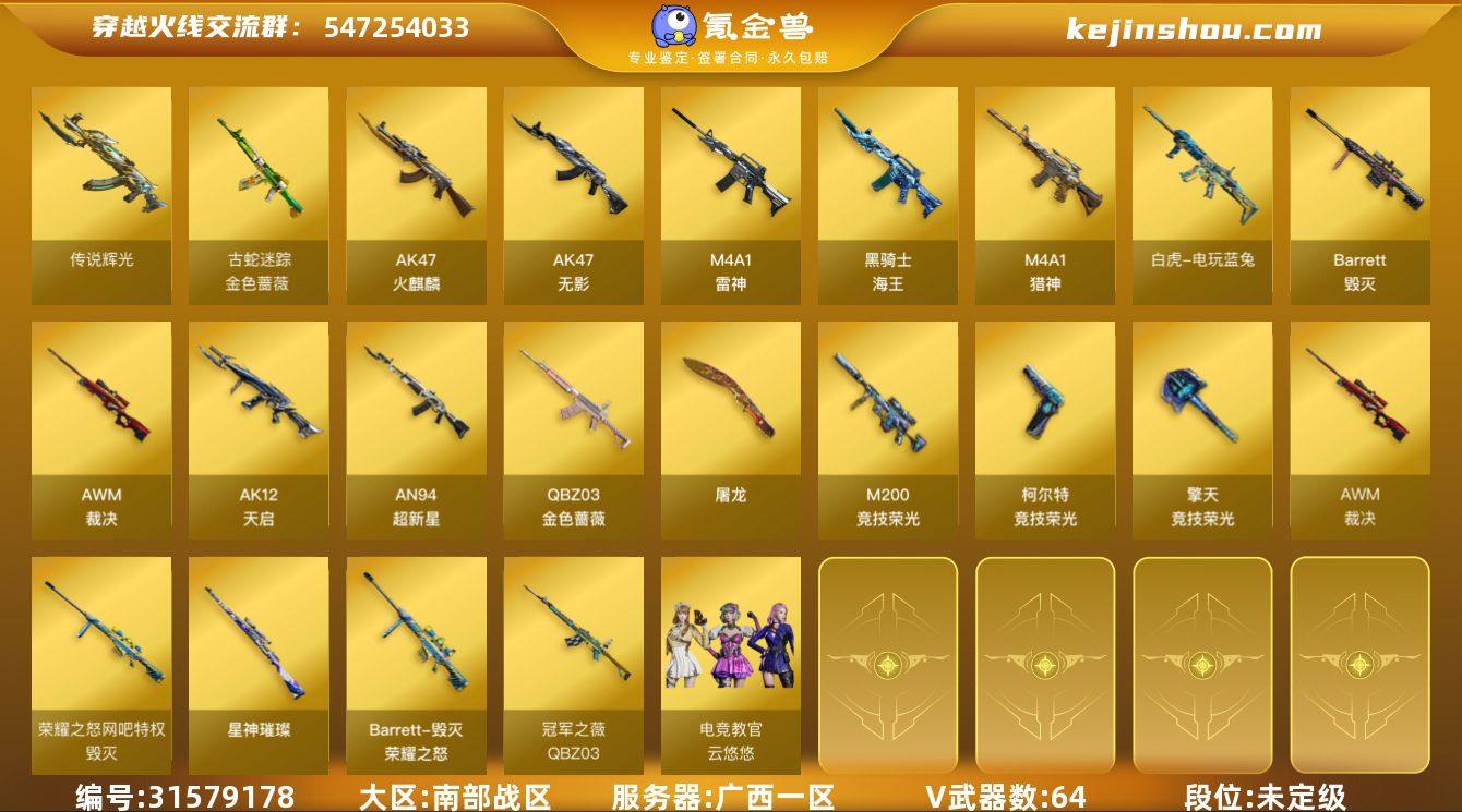 广西一区-68V-2王者-0炫金 【传说武器】:传说辉光 【热门武器】:传说辉光,QBZ03-金色蔷薇,金色蔷薇-古蛇迷踪,修罗-古蛇迷踪,M200-竞技荣光,白虎-电玩蓝兔,Kar98K-星神,羊驼玩偶*3,裁决-雪莉杨 【王者炫金武器】:王者凌虎 【音效卡】:Barrett-毁灭音效卡,AWM-裁决音效卡,Kar98K-星神音效卡,Barrett-碧霄极光音效卡*2,炼狱-百战金芒-庆典舞曲音效卡,死神-雪域霜狐-怀旧音效卡 【皮肤】:QBZ03-冠军之薇,裁决-流光秘银,星神-璀璨皮肤,雷神-荣耀之魄,M4A1-再燃火线,雷神-神秘按键 皮肤,火麒麟-白虎,毁灭-荣耀之怒,毁灭-星耀 皮肤,毁灭-英雄计划 皮肤,屠龙-星耀 皮肤,屠龙-破浪逐光 皮肤,轻型军用手斧-再燃火线 【角色】:电竞教官-云悠悠,战地猎狐,雪域霜狐,蛇隐宗,暗夜-X,电竞少女,潘多拉-甜心教官,青霞仙子,蛇姬,斯沃特-X 【人偶武器】:裁决-雪莉杨,AWM-灵狐-15周年嘉年华,生化手雷-机甲核心*2 【挑战大师】:激光毁灭者III-白马银枪 【英雄级武器】:AK47-火麒麟,M4A1-雷神*3,AK47-无影,AK12-天启,AN94-超新星*2,金色蔷薇-古蛇迷踪,死神-雪域霜狐,QBZ03-金色蔷薇,M4A1-猎神,黑骑士-海王,白虎-电玩蓝兔,Barrett-毁灭,AWM-裁决,Kar98K-星神,M200-竞技荣光,炼狱-百战金芒,柯尔特-竞技荣光*2,Anaconda-玄豹,修罗-古蛇迷踪,屠龙*4,擎天-竞技荣光,麒麟刺-百战金芒,丛林匕首-玄豹,高爆手雷-竞技荣光*9,高爆手雷-古蛇迷踪,闪光弹-竞技荣光*11,烟雾弹-竞技荣光*8,烟雾弹-古蛇迷踪,M4A1-赤狱骑士,M4A1-苍鸣雷神,Barrett-碧霄极光 【道具】:BS战队炫彩背包,CFS限定背包,云山科技背包,亚洲杯纪念炫彩背包,古蛇迷踪炫彩背包,女皇终结者-背包,百战金芒炫彩背包,超级背包,迷你冰龙背包,雪域霜狐炫彩背包,女皇终结者-魔龙之吻,救世主-黑桃战神...