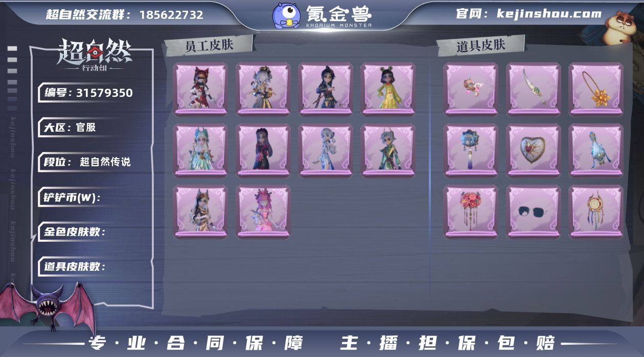 【段位】超自然传说 【幻梦皮肤数量】0 【星耀限定皮肤数量】0 【金色皮肤数量】0 【紫色皮肤数量】12 【道具皮肤数量】16 【铲铲币】133w 【累充】9040金砖 【赛季魔盒】普通魔盒 【员工】莉莉、艾伦、爱德华、兰、小满、临云、小黄、爱丽丝、零、阿念、逍遥、薇薇安、巫铃儿、莉莉、艾伦、爱德华、兰、小满、临云、零、阿念、逍遥、薇薇安、巫铃儿 【紫色皮肤】阿念-庆宴绮愿、爱丽丝-耀眼的你、莉莉-莓果陷阱、莉莉-除妖小师妹、莉莉-情公主、薇薇安-白光莹、逍遥-泽引山海、爱丽丝-瑞羽衔春、巫铃儿-素影瑶光、爱丽丝-丝缕哀歌、逍遥-绣春逍影、小黄-呱呱雨衣 【道具皮肤】转轮手枪-新星时代、摸金符-花落精绝、黄牛能量饮料-青玉抱丹、腰包-宝剑八、音响-鸣沙鼓、额外的背包-飞花令、夜视仪-金丝眼镜、刺刀-碧络琅环、电击枪-甜蜜泡泡枪、腰包-月下莲台、急救包-蔷薇物语、摸金符-紫霄、背饰-小小情公主 【美妆】暗夜小恶魔 【头饰】烛光纪念、蒜了八、樱桃奶油布丁、惊魂南瓜头套、小财神豚豚头套、鱼头怪头套、烈焰红唇头套、大葱明头套、火爆了头套、面具马头套、哈士奇头套、萨卡班甲鱼头套、嘻嘻头套、滑稽头套、呆滞头套、卑微头套、驼半仙头套、小狗蛇点点头套、咬咬鲨头套、炙热烧烤、像素朋克墨镜、后室幸存者头套 【挂饰】未竟乐园、小鲨包包、钗头凤、糖果守卫 【动作】鞭子舞、sugar摇、luvaboy、刀马舞、DL摇、鹏友摇、心跳摇、舞台中心、带你逃跑吧、举牌、抬手、KT猫摇、失落、小鸡舞