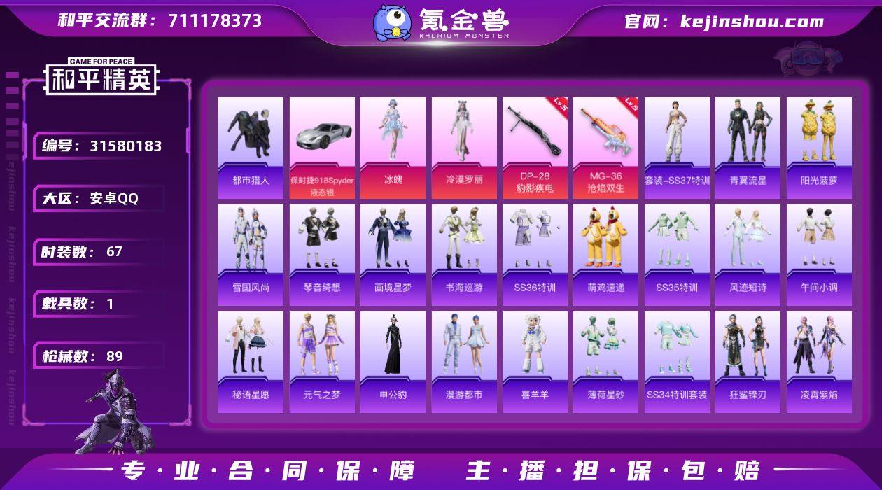 "HX1377 无二次 安卓Q-段位皇冠 53级 4印记 67套装89枪皮 【1载具】 保时捷918 Spyder(液态银) 【2粉装】 角色-冷漠罗丽 角色-冰魄 【2特效枪】 MG-36-沧焰双生 5级 DP-28-豹影疾电 5级 【热门】 都市猎人 浪漫天命 绯夜呢喃头饰 暮色狼梦头饰 角色-申公豹 擎苍青焰 凌霄紫焰 朱霞炽焰 角色-绛羽幽主 迅捷狂鲨 AKM-缤纷海域 【1飞行器】 炫彩糖果飞行器 "