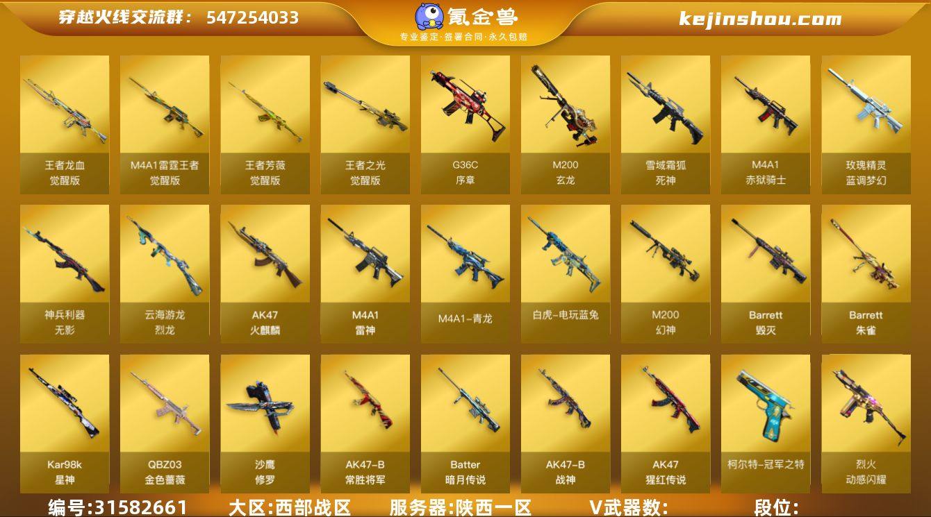 LC8070/西部/陕西一区/可排位/39v/【四防传说角色/传说女帝/】/传说夜影/【四防角色/幻神/幻神降龙/幻神荣耀世冠白鲨/幻神音效卡/】/星神/QBZ金色蔷薇/QBZ冠军之薇/白虎电玩蓝兔/LCA雷霆王者/王者龙血/觉醒版/柯尔特冠军之特/冠军之刃/【角色】/月兔特工/奇洋探员/乔伊教练/修道士/雪域霜狐/云海玲珑/【音效卡/雷神音效卡/毁灭音效卡/死神雪域霜狐怀旧音效卡/】/【枪皮】/黑骑士少林/修罗叶芒苍灵/雷神老干爹/王者武器/王者芳薇/王者之光/炫金武器/炫金武士/【小人枪/火麒麟灵狐/*2/天龙曼陀罗/COP白鲨/】/永久AC/有过十年记录/找回包赔