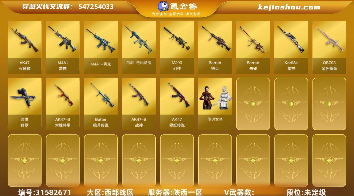 8070/西部/陕西一区/可排位/39v/【四防传说角色/传说女帝/】/传说夜影/【四防角色/幻神/幻神降龙/幻神荣耀世冠白鲨/幻神音效卡/】/星神/QBZ金色蔷薇/QBZ冠军之薇/白虎电玩蓝兔/A雷霆王者/王者龙血/觉醒版/柯尔特冠军之特/冠军之刃/【角色】/月兔特工/奇洋探员/乔伊教练/修道士/雪域霜狐/云海玲珑/【音效卡/雷神音效卡/毁灭音效卡/死神雪域霜狐怀旧音效卡/】/【枪皮】/黑骑士少林/修罗叶芒苍灵/雷神老干爹/王者武器/王者芳薇/王者之光/炫金武器/炫金武士/【小人枪/火麒麟灵狐/*2/天龙曼陀罗/COP白鲨/】/永久AC/有过十年记录/找回包赔