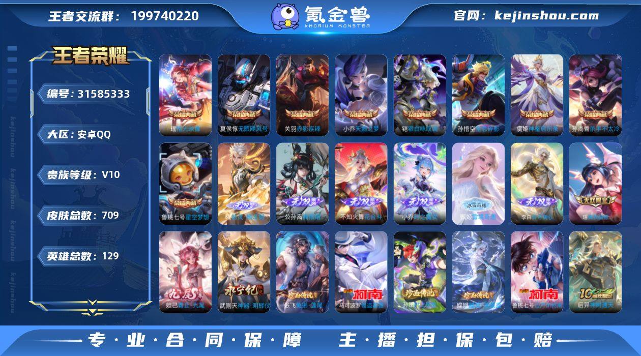 实名: 可修改 贵族等级: V10 英雄数: 129 皮肤数: 709 荣耀水晶: 武则天,天鹅之梦,星空梦想,无限飓风号,杀手不太冷,全息碎影,赤影疾锋,银白咏叹调,神鉴启示录,拾光映像 无双皮: 真我赫兹(瑶),神器·明辉仪,青丘·九尾,碎月剑心,小乔时之魔女,花合斗,离恨烟,雪境奇遇-甄姬,器灵·螭龙剑 珍品传说: 江户川柯南,怪盗基德,时之奇旅-孙策,器灵·落星盏,兔狲·蓬尾 传说皮: 黄金狮子座,黄金射手座,冠军飞将,云鹰飞将,绛天战甲,黄金白羊座,猫影幻舞,久胜战神,炽阳神光,一念神魔,云霓雀翎,末日机甲-孙尚香,地狱火,仲夏夜之梦,音你心动-小乔,零号·赤焰,海洋之心,地狱之眼,飞鸢探春,音你心动-周瑜,胖达荣荣,李逍遥,乞巧织情,时之恋人-刘备,游龙清影,淬星耀世,超时空战士-狄仁杰,遇见胡旋,末日机甲-孙策,花朝如约,挚爱之约,无双飞将,音你闪耀,碎云,神器·狴犴令,神器·明辉仪,山海·炽霜斩,山海·琳琅生,山海·苍雷引,炽翼辉光,燃星之曲,画中仙,浮生妄,记忆之芯,百相守梦(张飞),追逃游戏(亚瑟),追逃游戏(安琪拉),电玩·雷克斯,鹤羽星尊,灼幽烈阳,妄想实况,妄想奇谈,鹤归松栖(云缨),惊梅引,遇见神鼓,鲁班七号-时之奇旅,大乔-时之奇旅,永恒水手月亮,夜礼服假面,小动物乐团,霜月吟,澜逐花归海,艾琳觅芳踪,琥珀纪元铠,琥珀纪元马超,乘龙·问璇玑,乘龙·铭钟鼎,乘龙·淬吴钩,貂蝉曦玄引,吕布曦玄引,典韦战鼓燎原,落雪白狼,金乌负日,黄金天蝎座,云中君群星魔术团,朵莉亚心动手记,铠冥王哈迪斯,牧神诗旅,启明星使,玄雷天君,幻光神枪,祥瑞亨通,星之鸣奏,千劫归真,续相思,神树通天 限定皮: 冰锋战神,遇见飞天,李小龙,奔雷神使,祈雪灵祝,游园惊梦,梁祝,御风骁将,云端筑梦师,时雨天司,引擎之心,龙胆,白鹤梁神女,武圣,烈魂,魔法小厨娘,辉光之辰,异界灵契-孙尚香,玄嵩,白晶晶,岱宗,天狼溯光者,虎魄,天魔缭乱,神威,蜜橘之夏,永曜之星,幽恒,时之彼端,奇迹圣...
