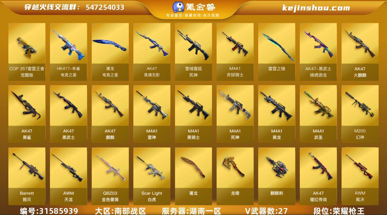 段位:荣耀枪王 VIP等级:VIP6 V武器数:27 王者武器数:1 COP 357-雷霆王者-觉醒版 AK47-竞魂无影,HK417-朱雀-电竞之星,屠龙-电竞之星,回声刃-荣耀传说,回声刃-荣耀之巅,死神-雪域霜狐,M4A1-赤狱骑士,雷霆之锋,AK47-黑武士-锦绣游龙,AK47-火麒麟,AK47-黑鲨,AK47-黑武士,AK47-麒麟,M4A1-雷神,M4A1-黑骑士,M4A1-死神,M4A1-黑龙,M4A1-武圣,M200-幻神,Barrett-毁灭,AWM-天龙,QBZ03-金色蔷薇,Scar Light-白虎,屠龙,龙啸,麒麟刺,AK-47-猩红传说,裁决 兰-海滩派对,战地猎狐 HK417-朱雀-电竞之星-竞星跃动音效卡,屠龙-电竞之星-竞星跃动音效卡,死神-雪域霜狐-怀旧音效卡,Barrett-毁灭音效卡 卖家说:幻神皮+宠儿+星火—白虎ag皮—雷神荣耀+qbz蔷薇电竞+毁灭荣耀+音效卡+王者cop+王者雷霆高爆4个+王者雷暴手雷3个 雷霆套装一套 四方角色一堆